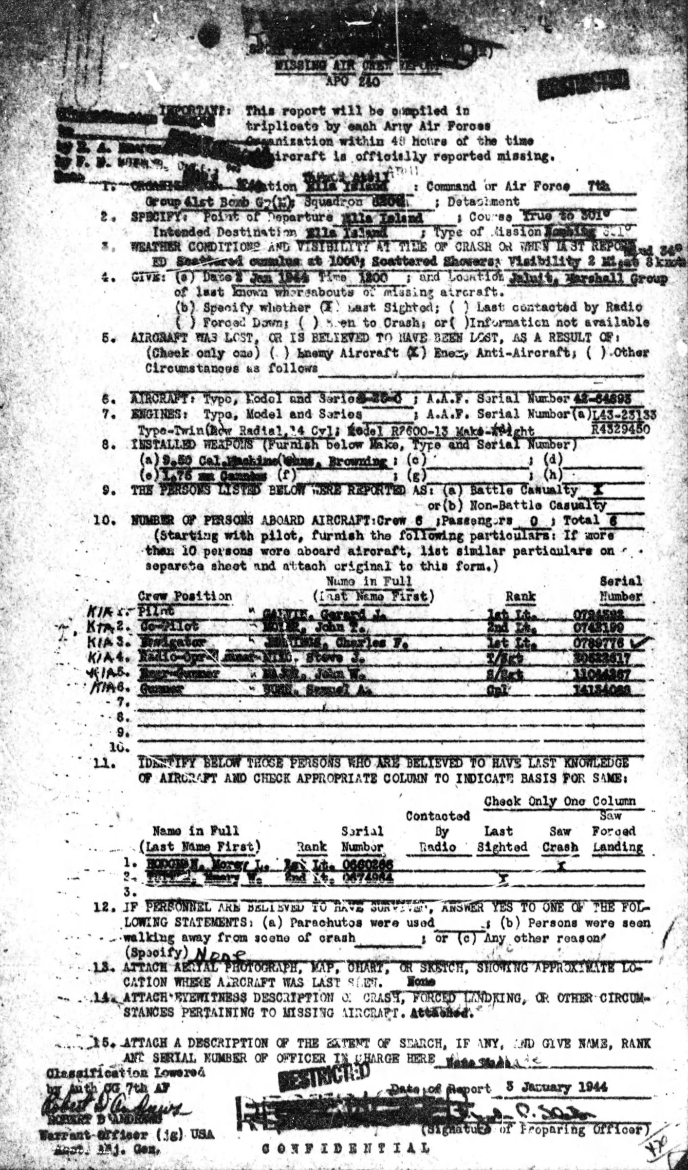 Took off from Tarawa Airfield. One of nine B-25’s flying at low altitude for a strike at Emiej Island part of Jaluit Atoll. Struck by anti-aircraft fire, and damaged. Reportedly losing part of its right wing, which struck the tail and caused the plane to invert, and then crashed into the lagoon off Imroij. After the war, the Japanese reported all died in the crash.
