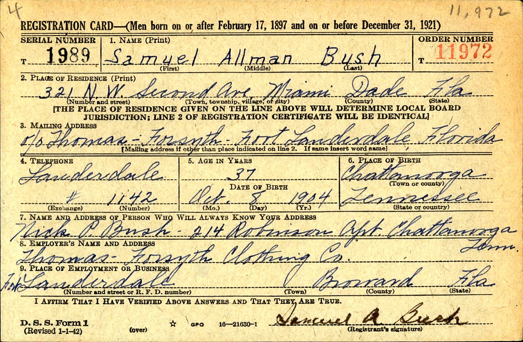 Samuel Allman Bush was born in Chattanooga, Tennessee to Nicholas “Nick”Pope Bush and Anna Venice Allman. He married Helen Elizabeth Graham in 1926. Their son Billy Graham Bush was born 2 years later in 1928. Samuel and Helen divorced in 1937.