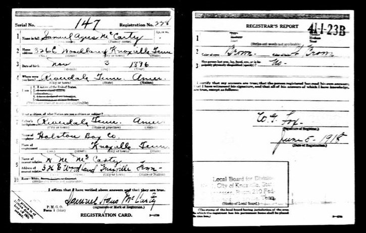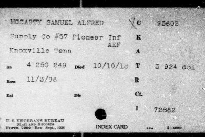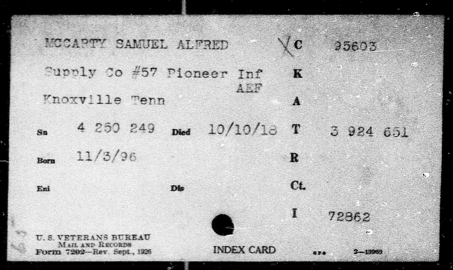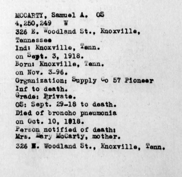 Samuel Alfred McCarty was born 3 November 1896 in Knoxville, Tennessee, son of Mary McCarty. He died of broncho pneumonia and is listed on the Tablets of the Missing at Meuse-Argonne American Cemetery, Romagne, France.