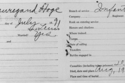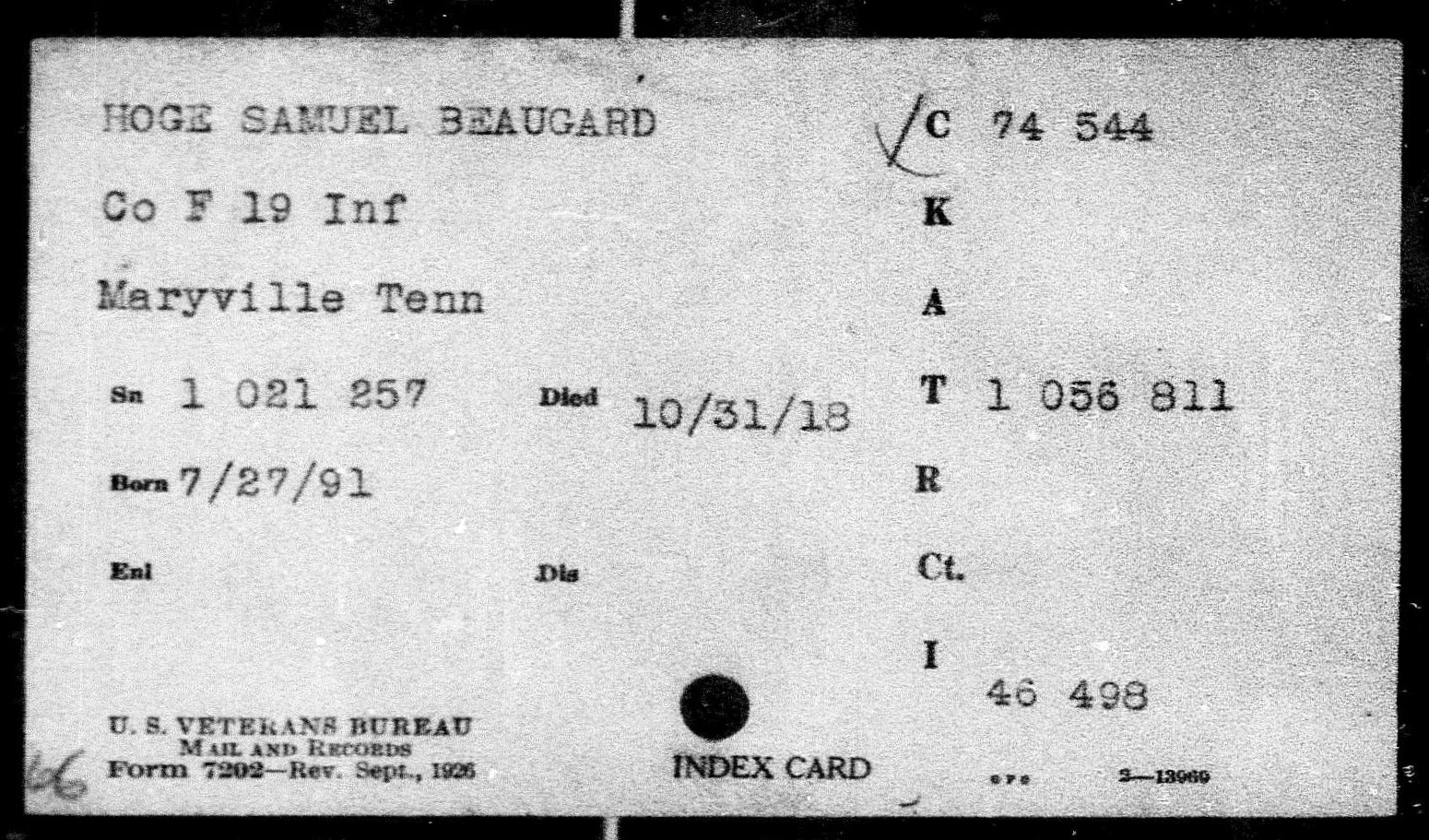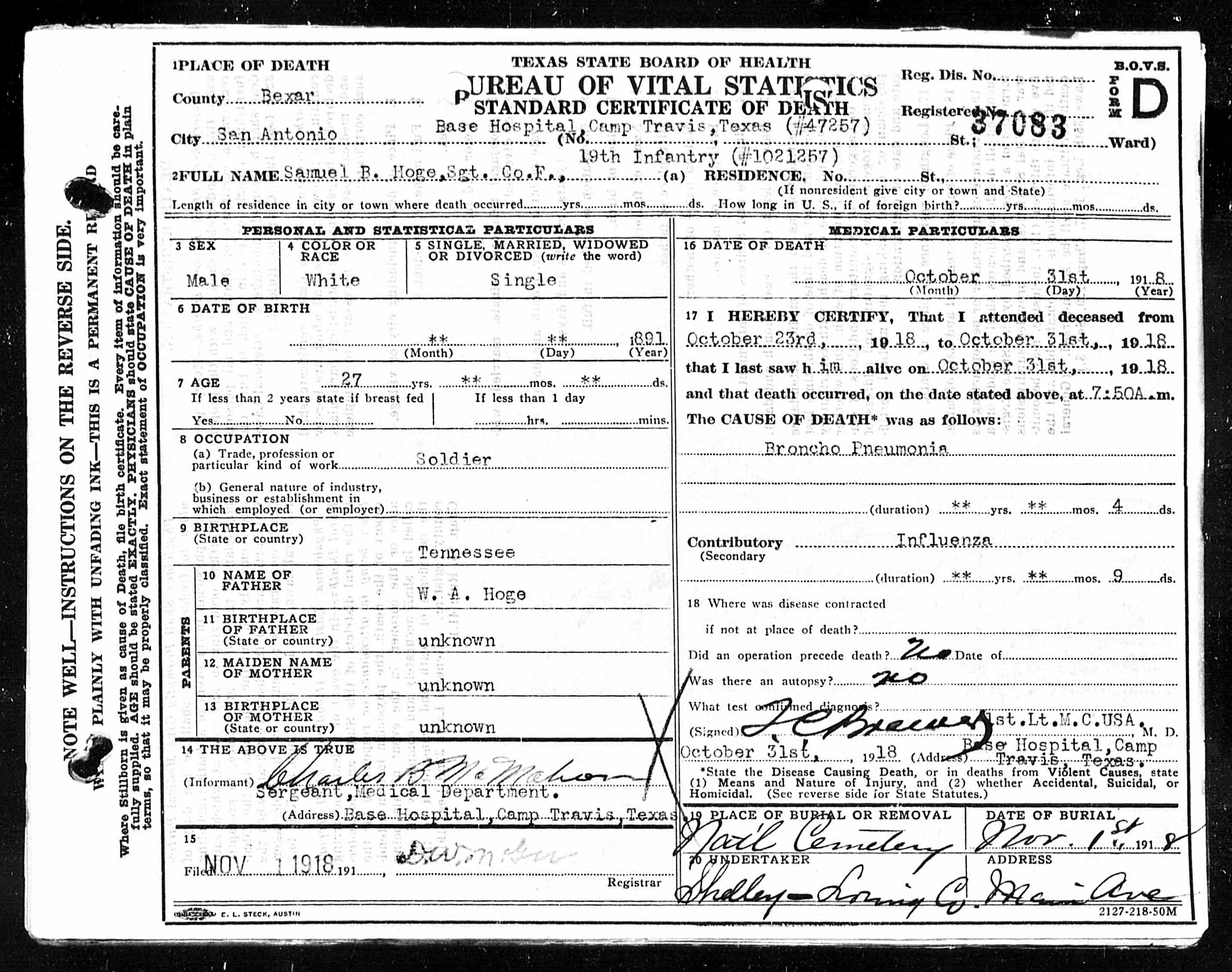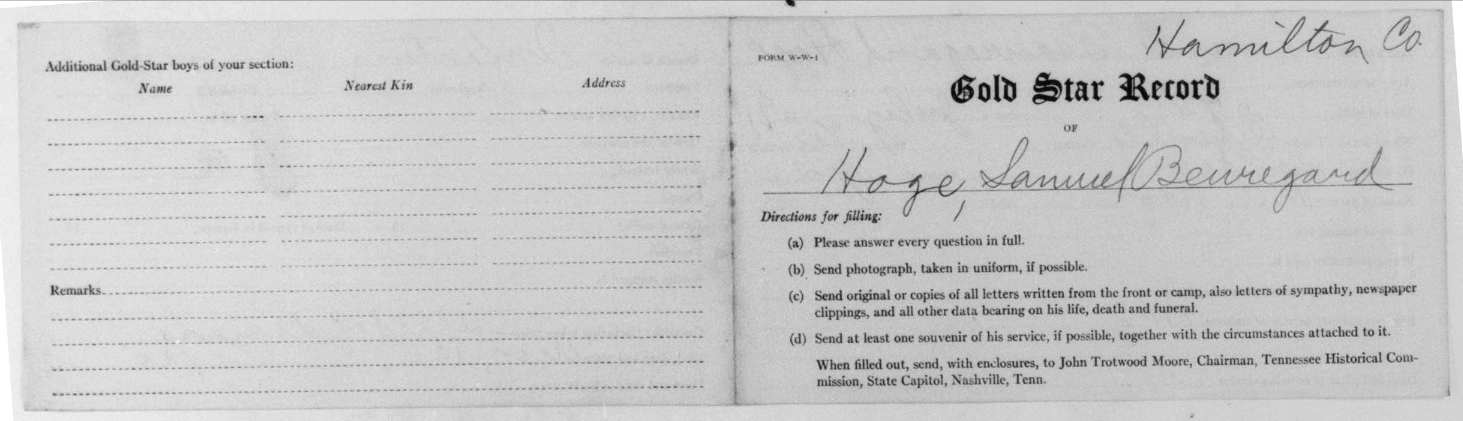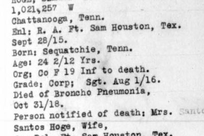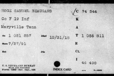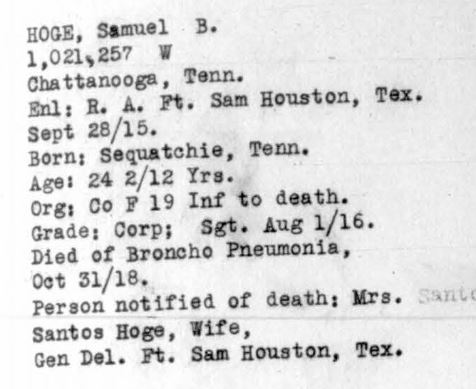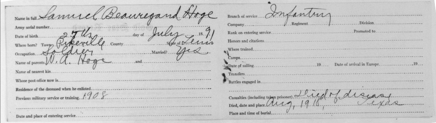 Samuel Beauregard Hoge was born in 1891 in Sequatche County, Tennessee. He died at the age of 27 at the Base Hospital at Cap Travis in Texas of Broncho Pneumonia. He was buried at the National Cemetery at San Antonio. He served with the 19th Infantry, Company F.