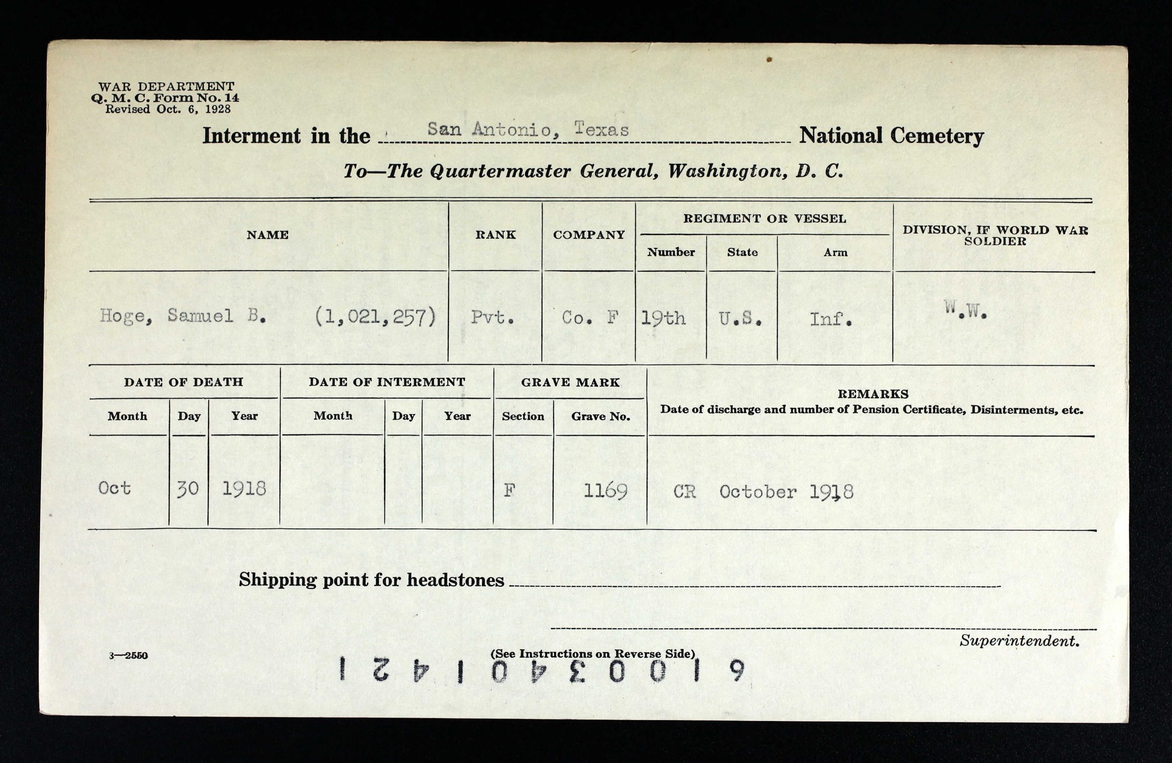 - Burial/Memorial Location: San Antonio National Cemetery, San Antonio, Bexar County, Texas