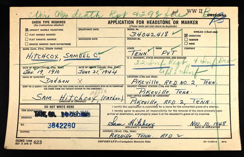 Samuel Clinton Hitchcock was born on 19 January 1910 at Pikeville, Tennessee, the son of Samuel Denton Hitchcox and ary Caroline “Callie” McWilliams.