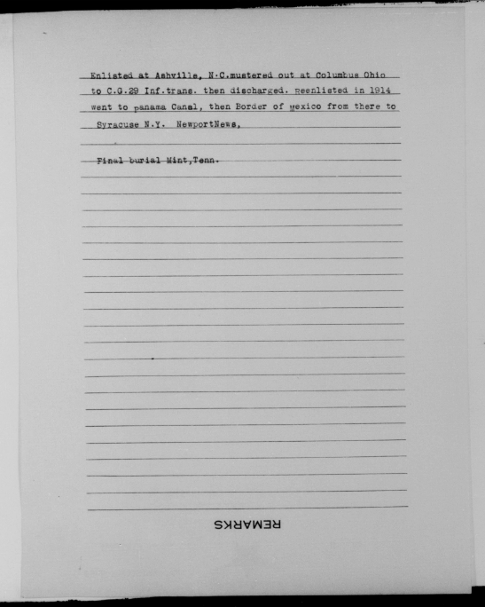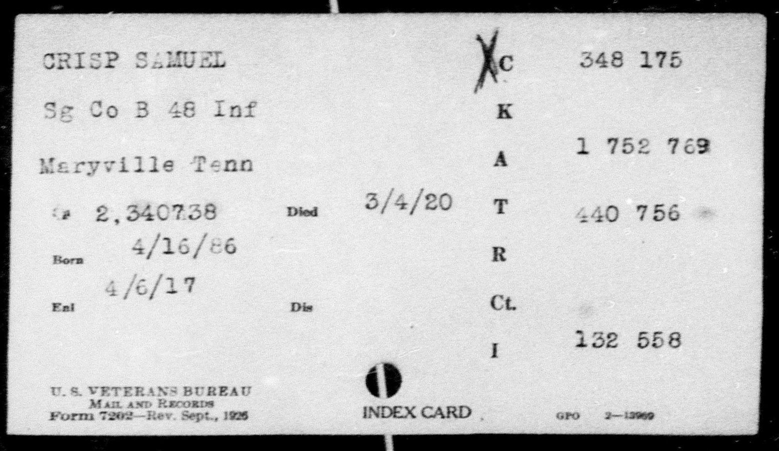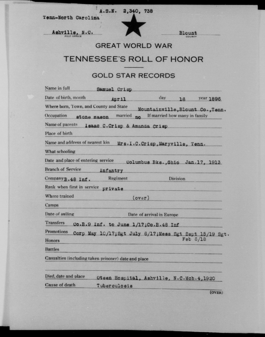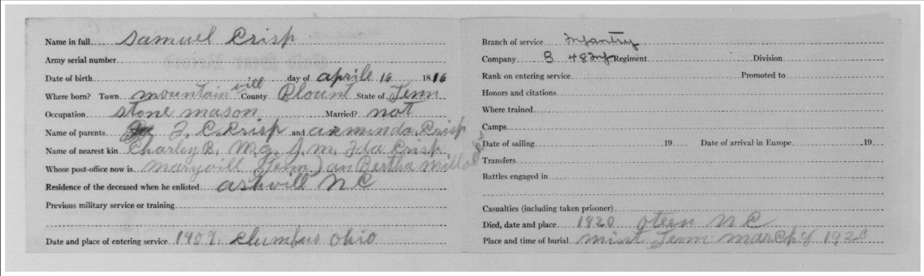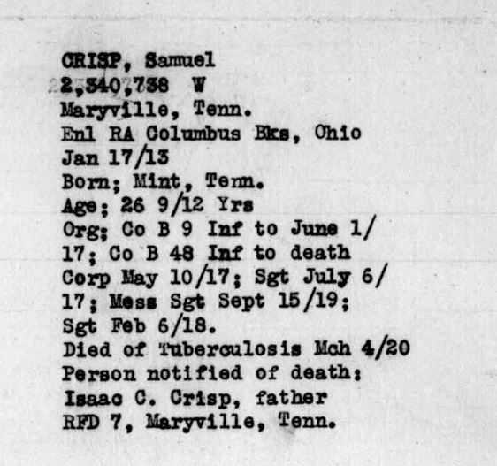Sergeant Crisp enlisted in the military on September 7, 1909. He served at Fort Michie in Suffolk, New York in 1910. He was discharged on September 6, 1912 at Fort H. G. Wright. He later reenlisted for service in World War I. He died of Tuberculosis on March 4, 1920 in Asheville, North Carolina after being sick for nine months. He is buried in Little Kagley Cemetery in Blount County.