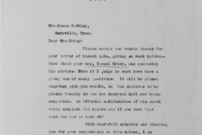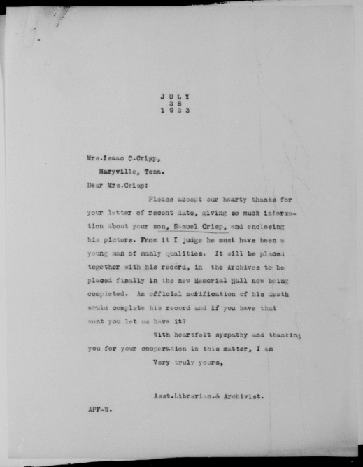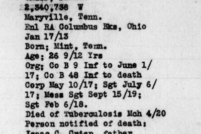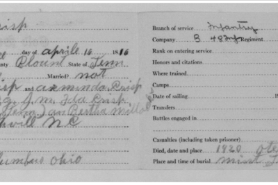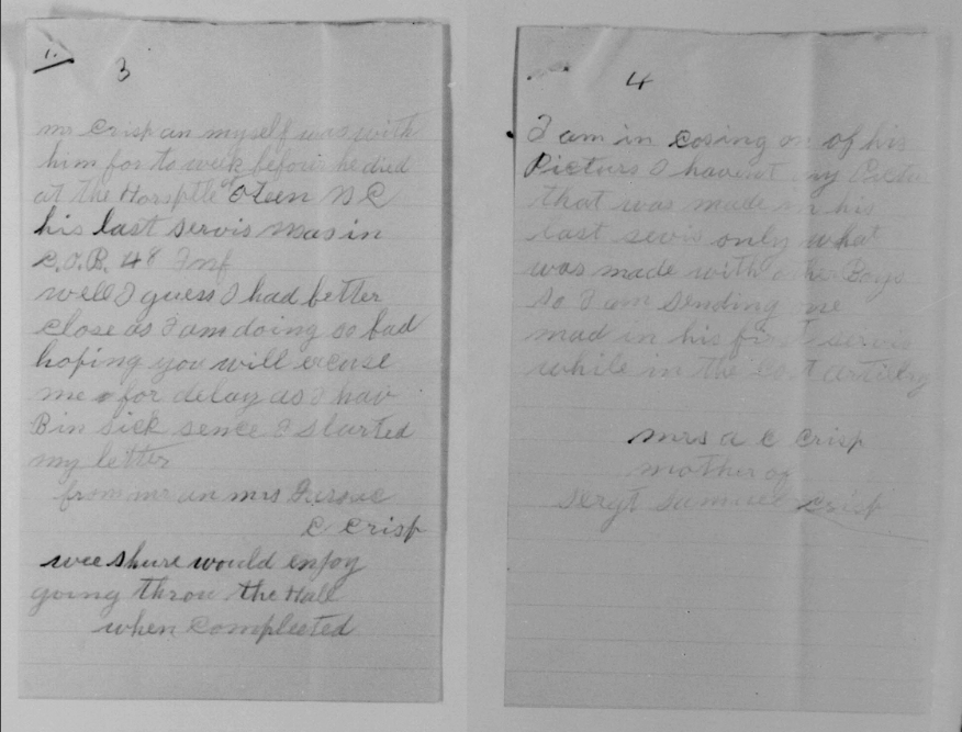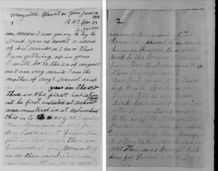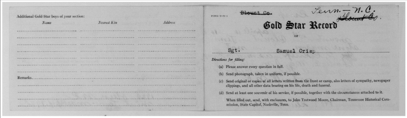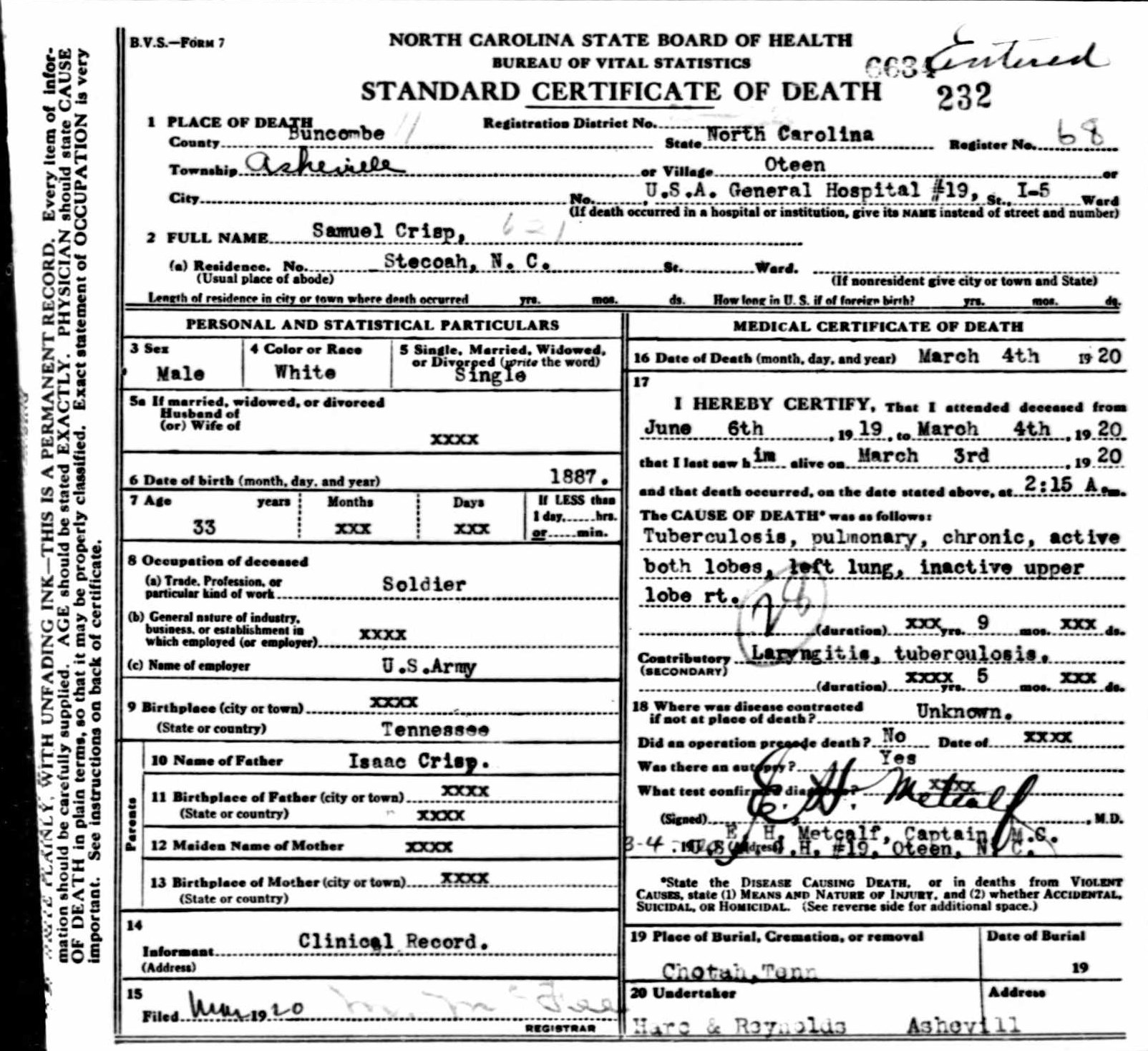 Sergeant Crisp enlisted in the military on September 7, 1909. He served at Fort Michie in Suffolk, New York in 1910. He was discharged on September 6, 1912 at Fort H. G. Wright. He later reenlisted for service in World War I. He died of Tuberculosis on March 4, 1920 in Asheville, North Carolina after being sick for nine months. He is buried in Little Kagley Cemetery in Blount County.