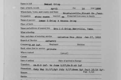 Sergeant Samuel L. Crisp was born on April 16, 1886. He was the son of Arminda Charles Crisp and Isaac C. Crisp. He was the brother of Ida Ann Crisp, Charles Burger Crisp, William Granville Crisp, Jessie Mortimer Crisp, and Bertha Ellen Crisp Willocks. Prior to joining the military, he worked as a stonemason.