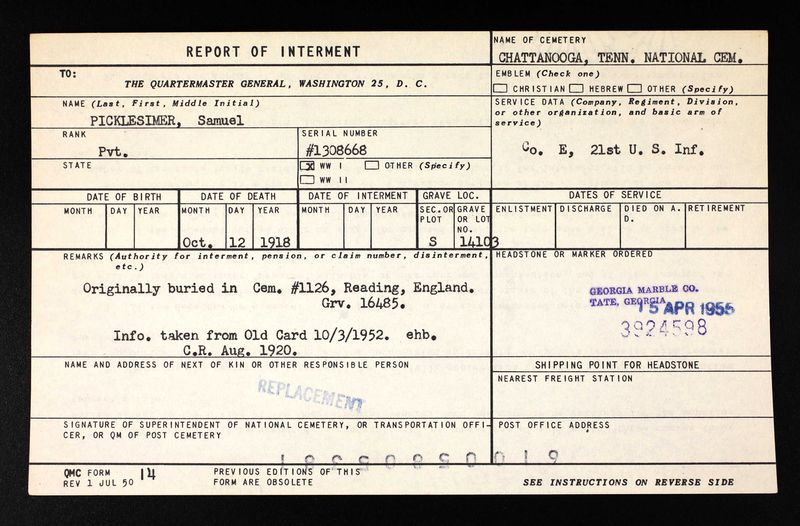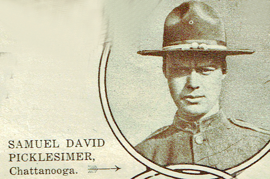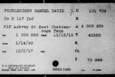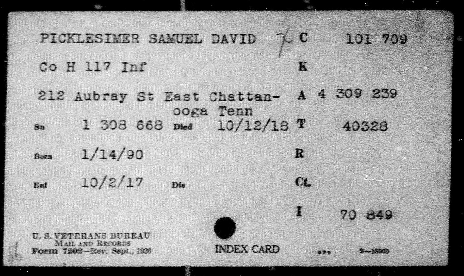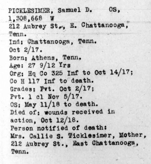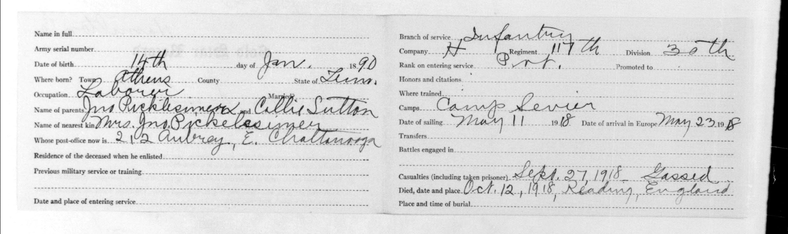 Samuel Davis Picklesimer was born in Athens, Tennessee, son of Callie S. Picklesimer. He was gassed on September 27, 1918 and died 12 October 1918 in Reading, England. Pvt Picklesimer was initially buried in Cemetery #1126, Reading, England. Buried at Chattanooga National Cemetery, S, 14103.