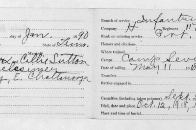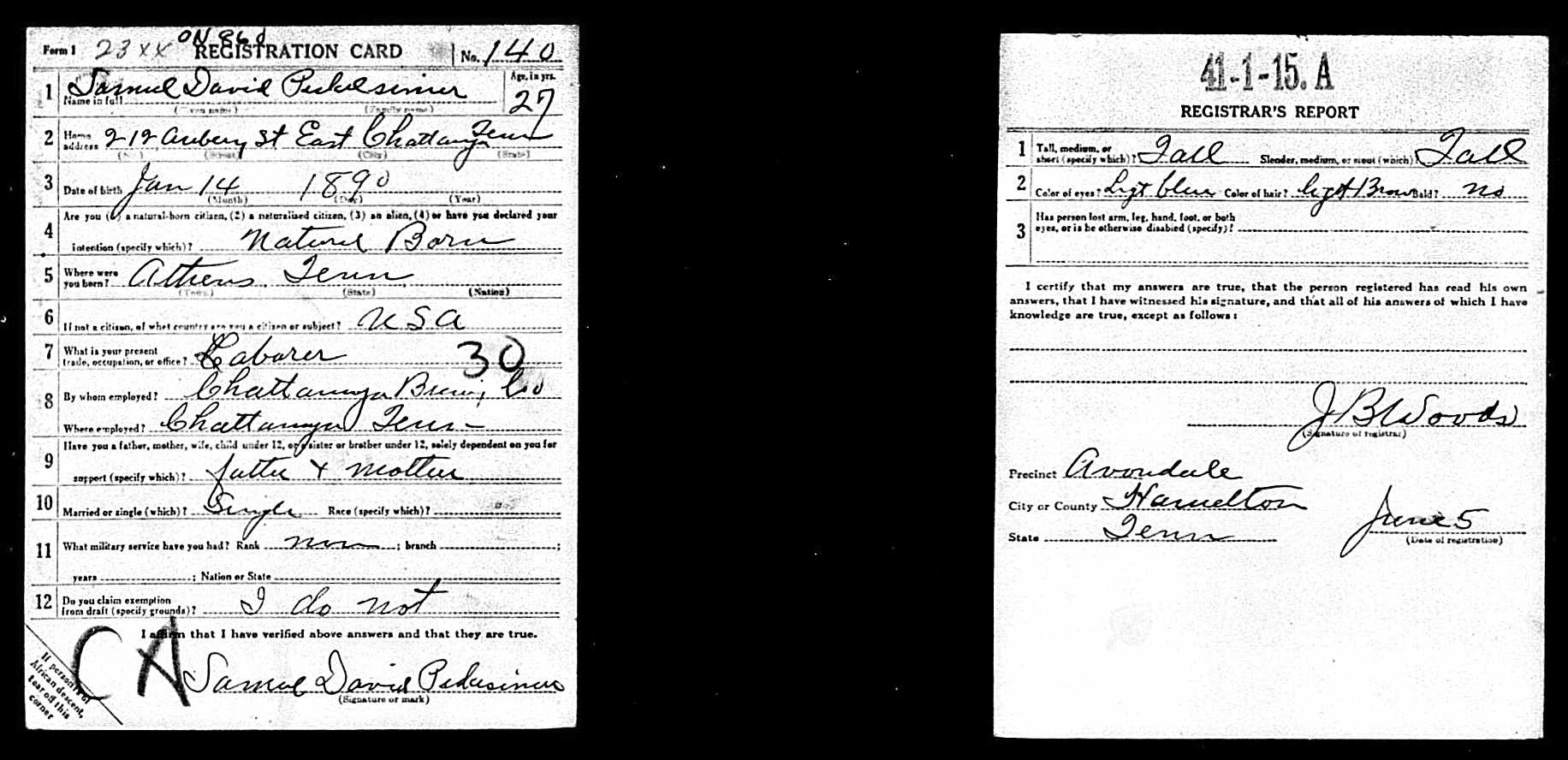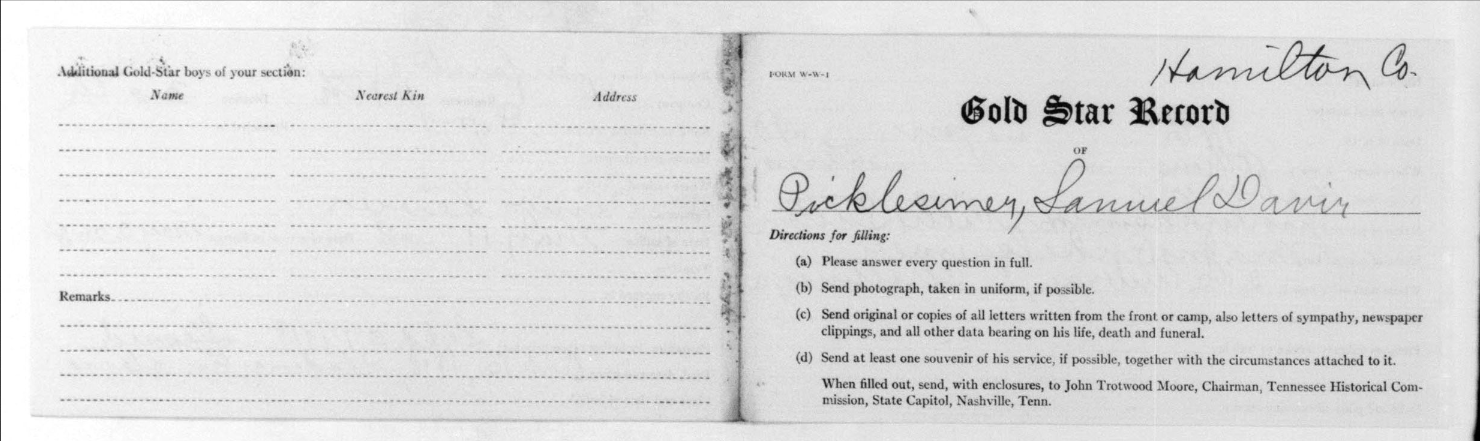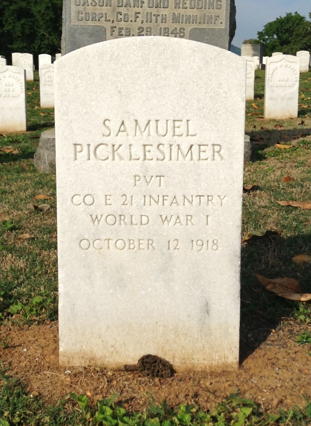Samuel Davis Picklesimer was born in Athens, Tennessee, son of Callie S. Picklesimer. He was gassed on September 27, 1918 and died 12 October 1918 in Reading, England. Pvt Picklesimer was initially buried in Cemetery #1126, Reading, England. Buried at Chattanooga National Cemetery, S, 14103.