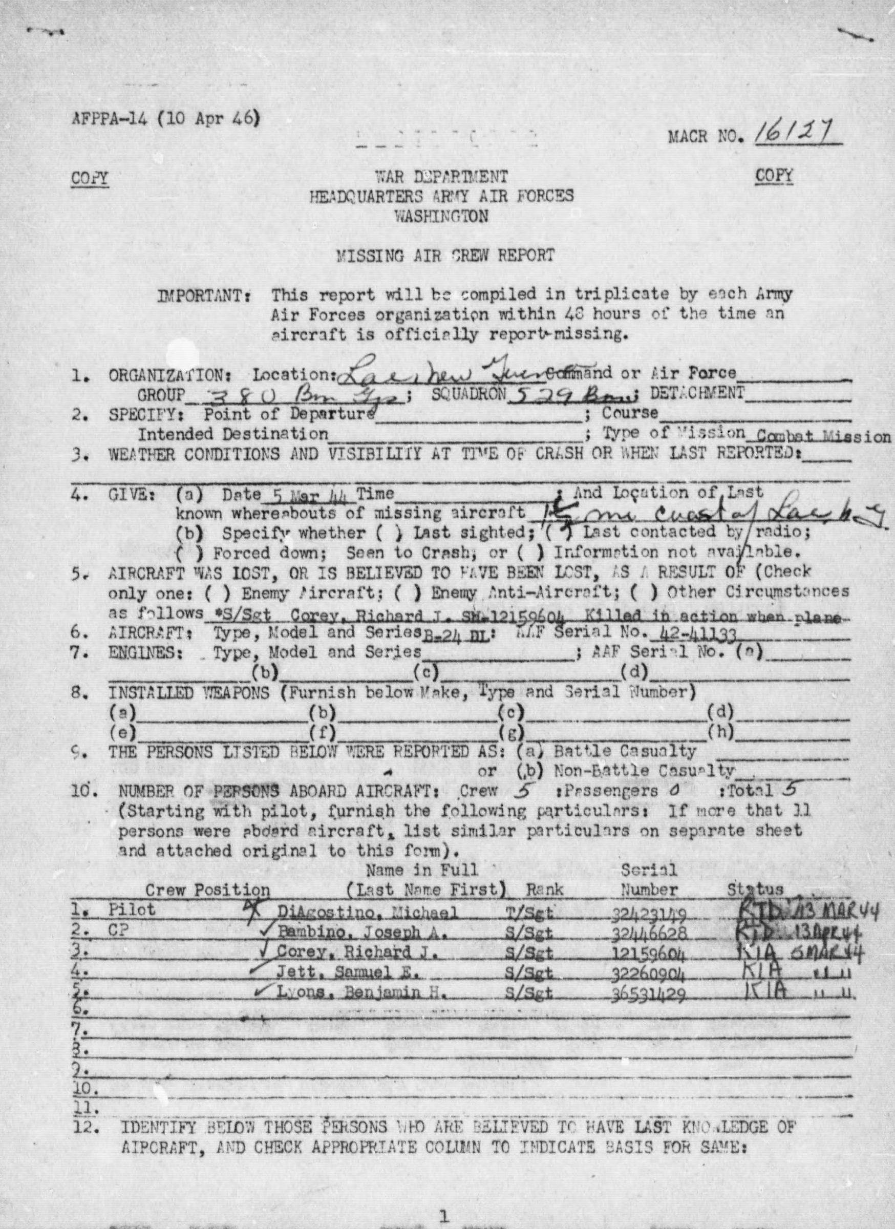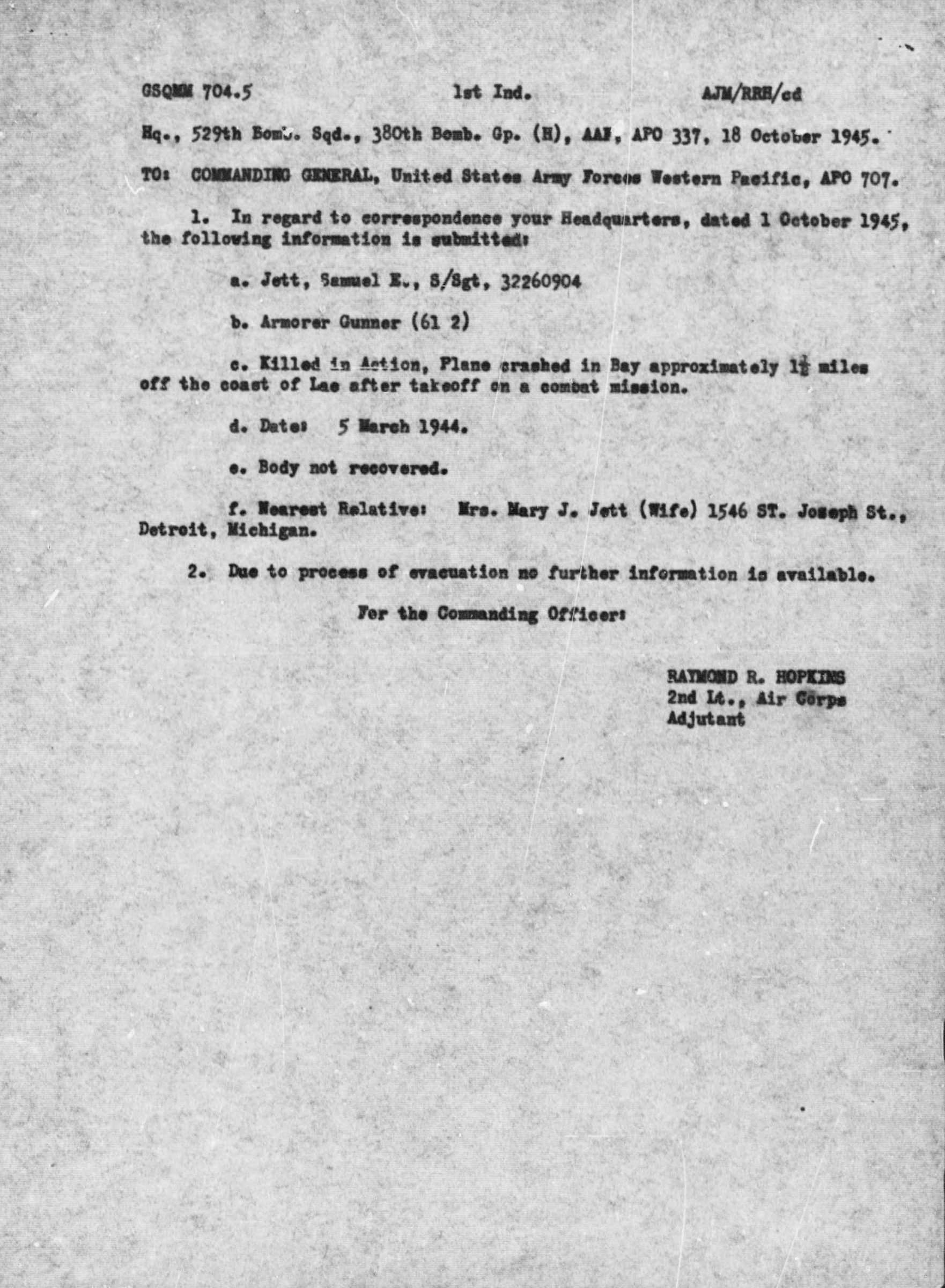 Aircrafth B-24 with serial number 42-41133 in Bay approximately 1 ½ miles off the coast of Lae, New Guinea after takeoff on a combat mission on 5 March 1944. His body was never recovered.