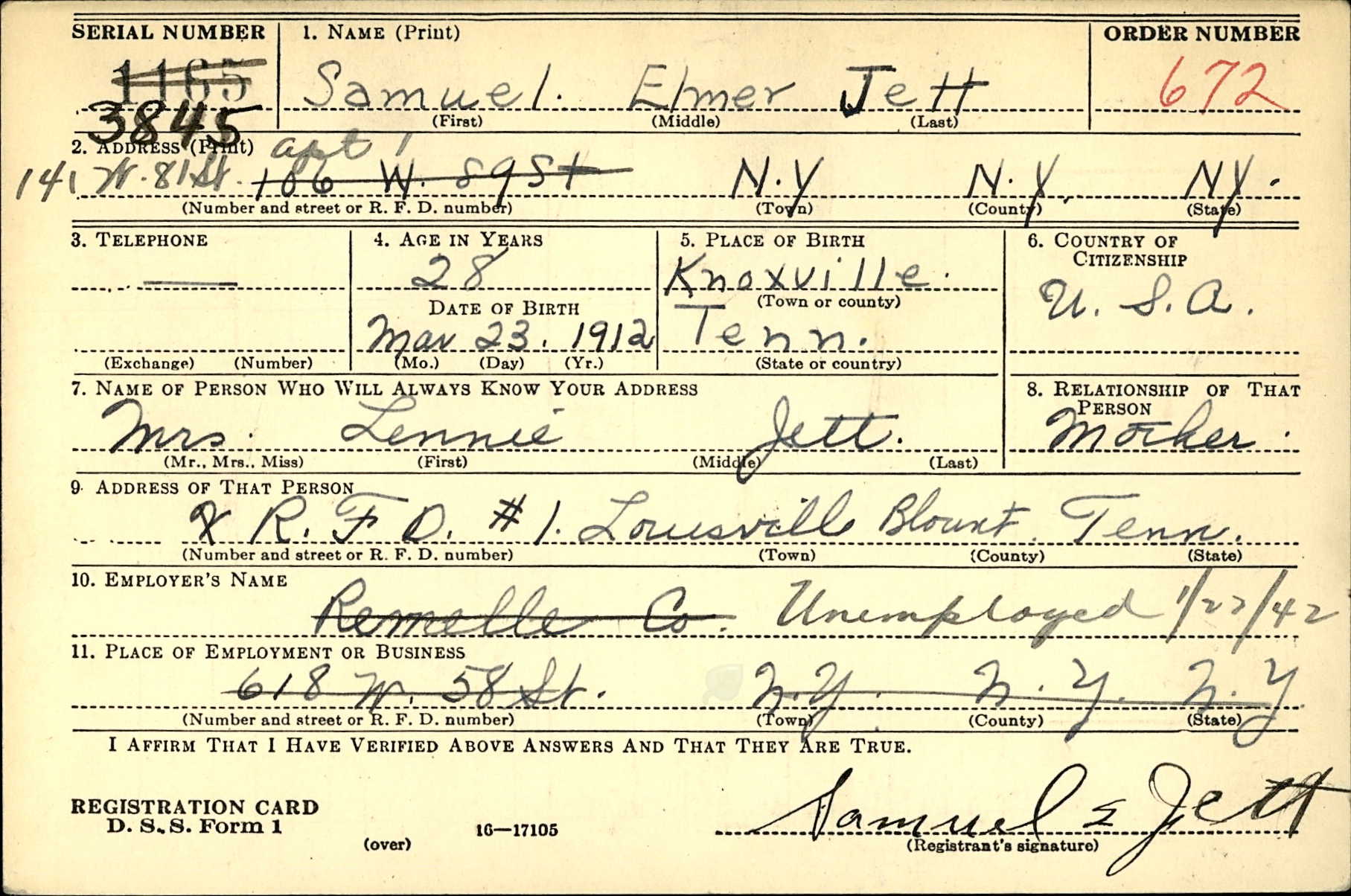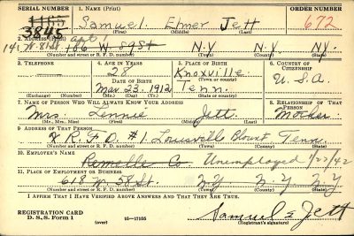 Samuel Elmer Jett was born in Jefferson City, Tennessee, the son of John Daniel Jett and Lainie Castile. He was married to Mary Jean Liberato.