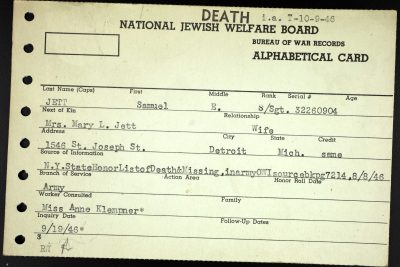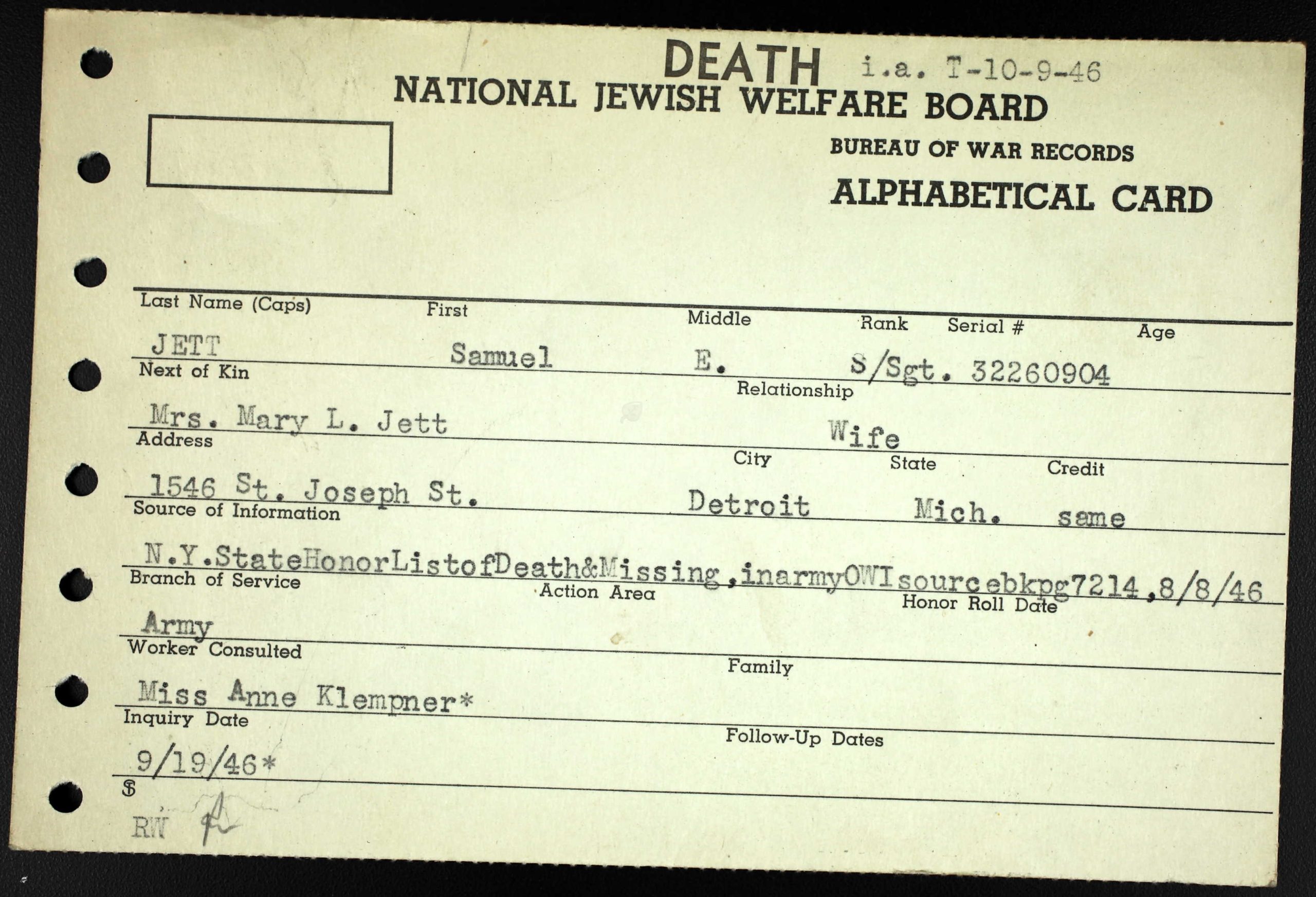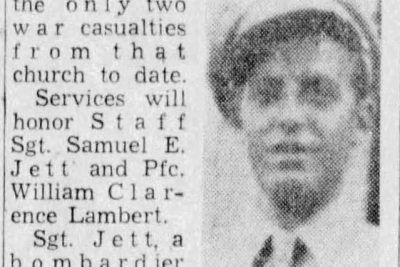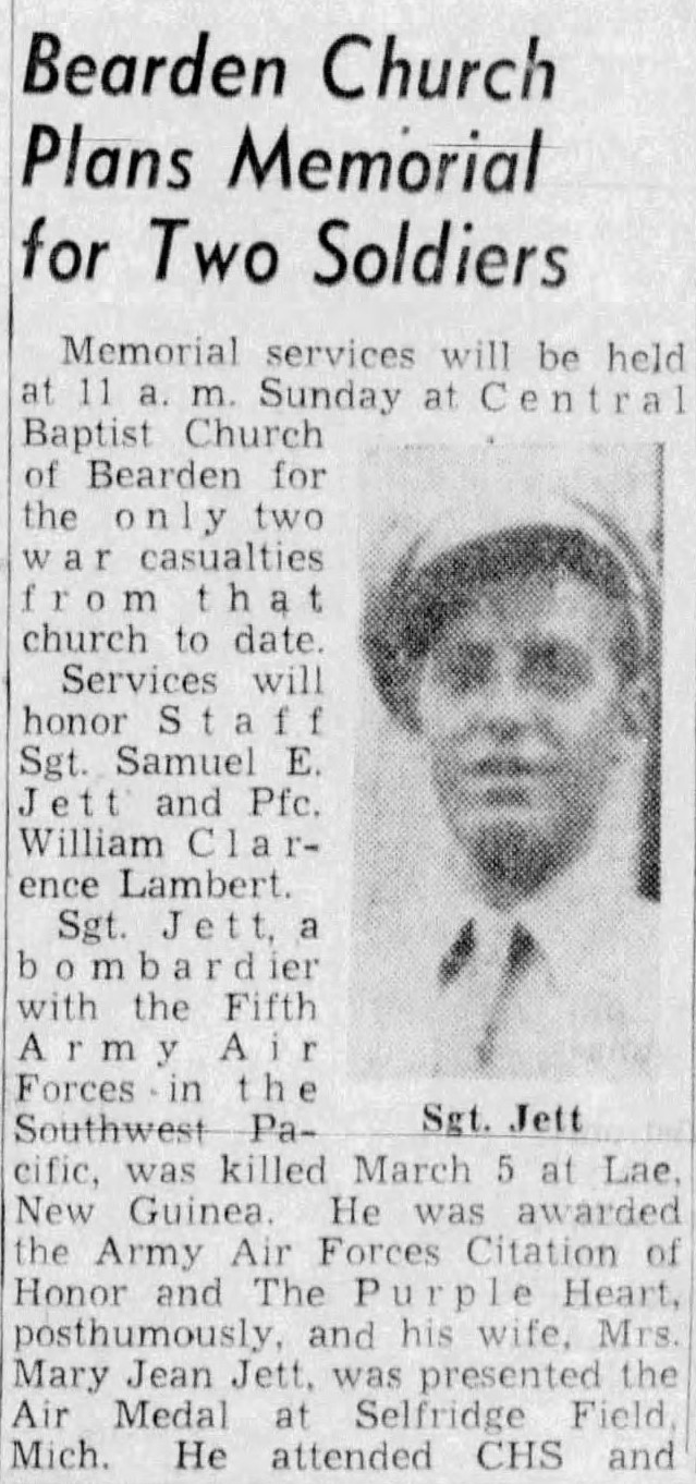 Memorial services will be held at Central Baptist Church of Bearden for the only two war casualties from that church to date. Service will honor Staff Sgt. Samuel E. Jett and Pfc. William Clarence Lambert. Sgt. Jett, a bombardier with the Fifth Army Air Forces in the Southwest Pacific, was killed March 5 at Lae, New Guinea. He was awarded the Army Air Forces Citation of Honor and the Purple Heart posthumously, and his wife, Mrs. Mary Jean Jett, was presented the Air Medal at Selfridge Field, Mich. He attended CHS and Tennessee Military Institute. He was 31. Pfc. Lambert was killed in action in Italy Sept. 17, after serving in the Army a year.