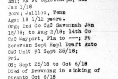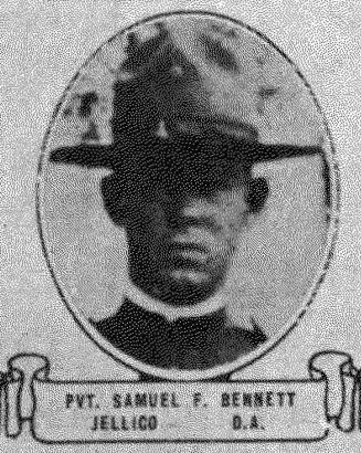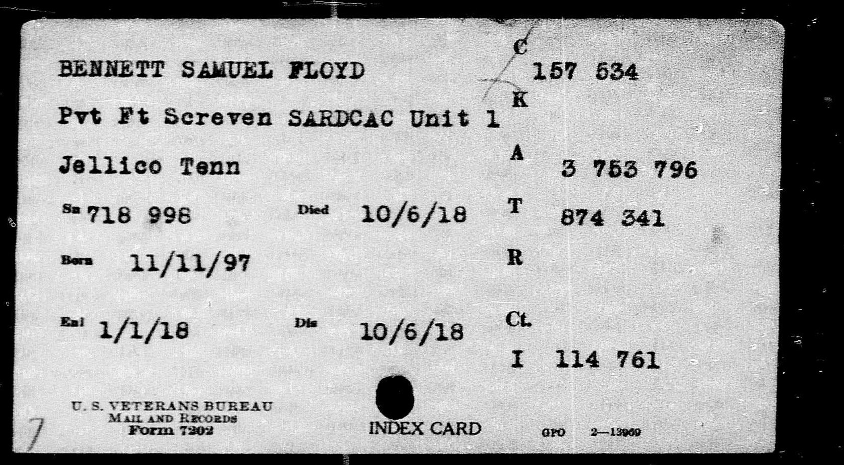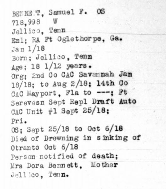 Samuel Floyd Bennett was born 11 November 1897 and was from Jellico, TN. He went down with the sinking of HMS Otranto after a collision with HMS Kashmir on 6 October 1918: “About three hours after the collision, a large wave dropped Otranto onto Old Women’s Reef”, about three-quarters of a mile (1.2 km) offshore, near the entrance to Machir Bay, missing a sandy beach just north of the reef. The action of the enormous waves quickly broke the ship in half and then ripped her bottom out. Of the roughly 489 men aboard after Mounsey departed, only 21 (17 of these were American) were able to successfully swim ashore, although two of these, including one American, later died of their injuries”.