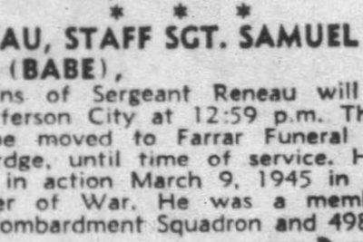 Samuel F. Reneau and Henry S. Solomon (from Brownsville, Haywood, Tennessee) were crew members on aircraft 44-69747. The B-29 was lost when it hit mountain Wasurezu, Shichigashuku-mura, Miyagi Prefecture on Honshu Island in bad weather on the night of March 9-10, 1945 while returning from a reaid on Tokyo. All on board were killed.