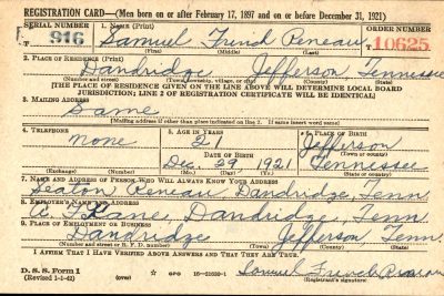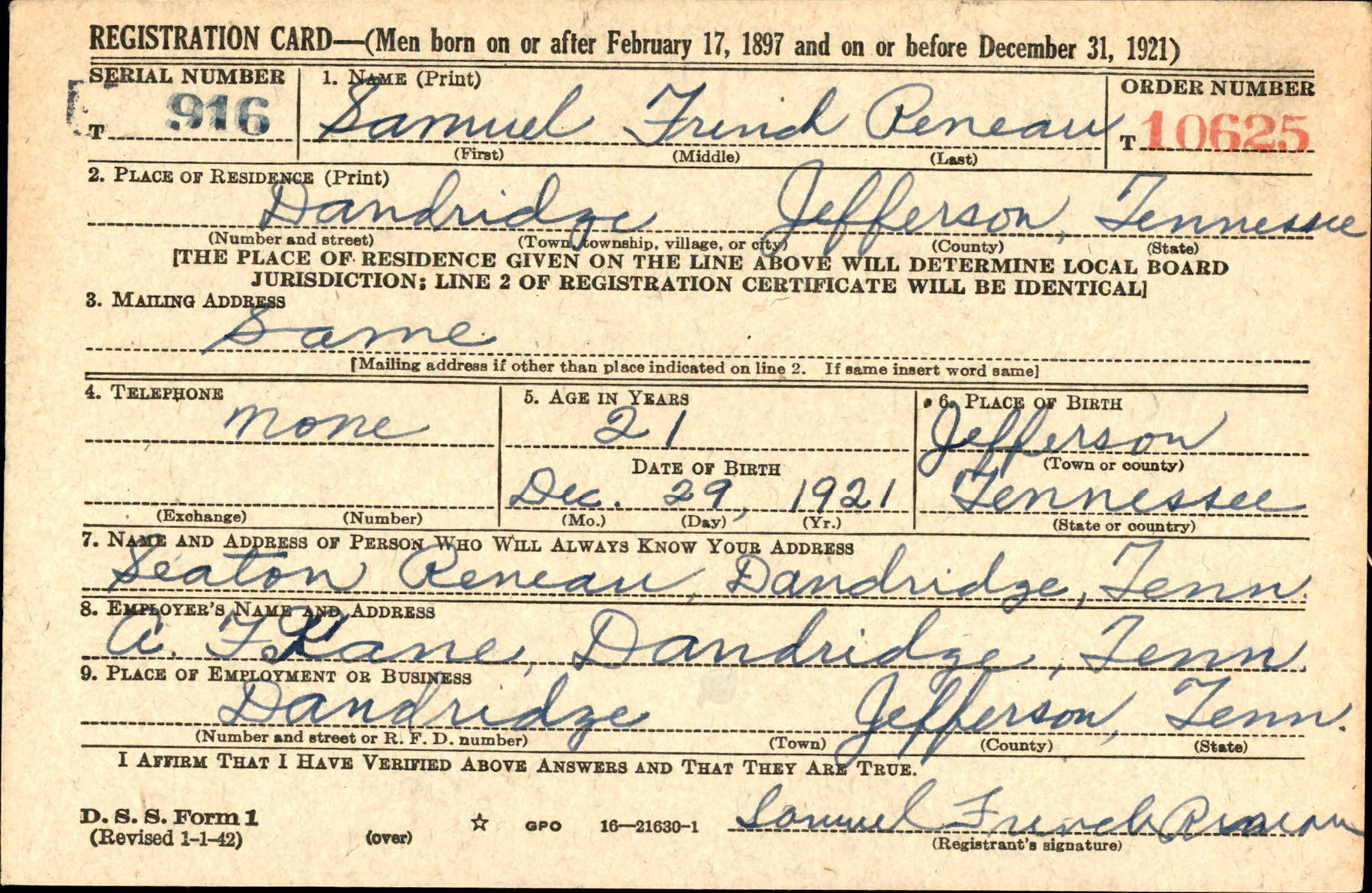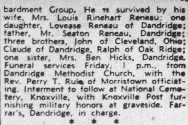 Husband of Levence M. Reneau, Route 1, Dandridge, Tennessee