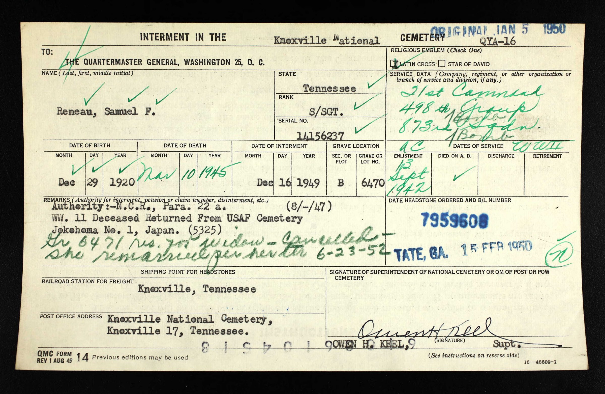 Returned from USAF Cemetery Jokohoma No. 1, Japan in 1949