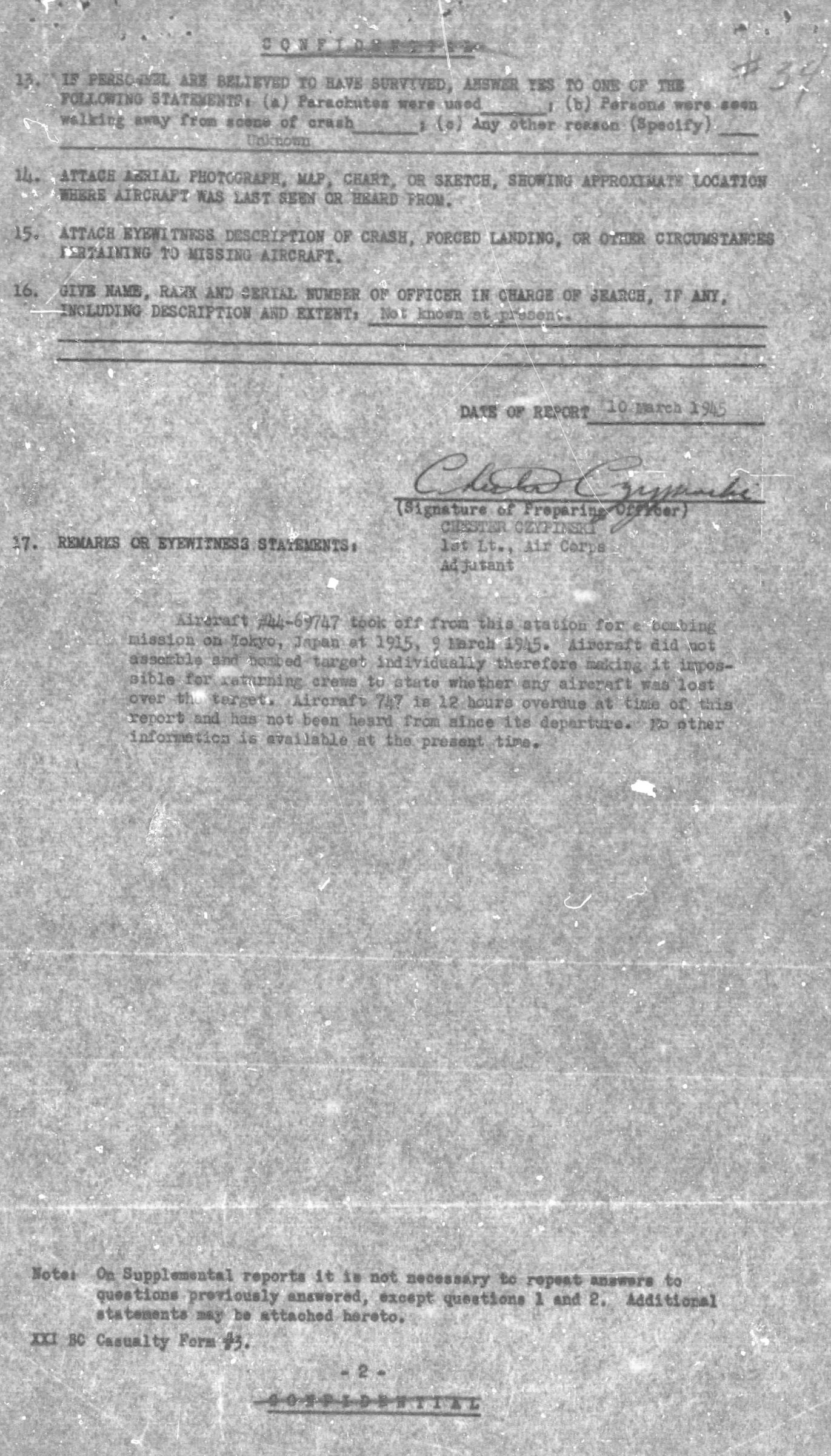 Aircraft B-29 with serial number 44-69747, which took off from this station for a bombing mission on Tokyo, Japan at 1915, 9 March 1945. Aircraft did not assemble and bombed target individually therefore making it impossible for returning crews to state whether any aircraft was lost over the target. Aircraft 747 is 12 hours overdue at time of this report and has not been heard from since its departure. Not other information is available at the present time.