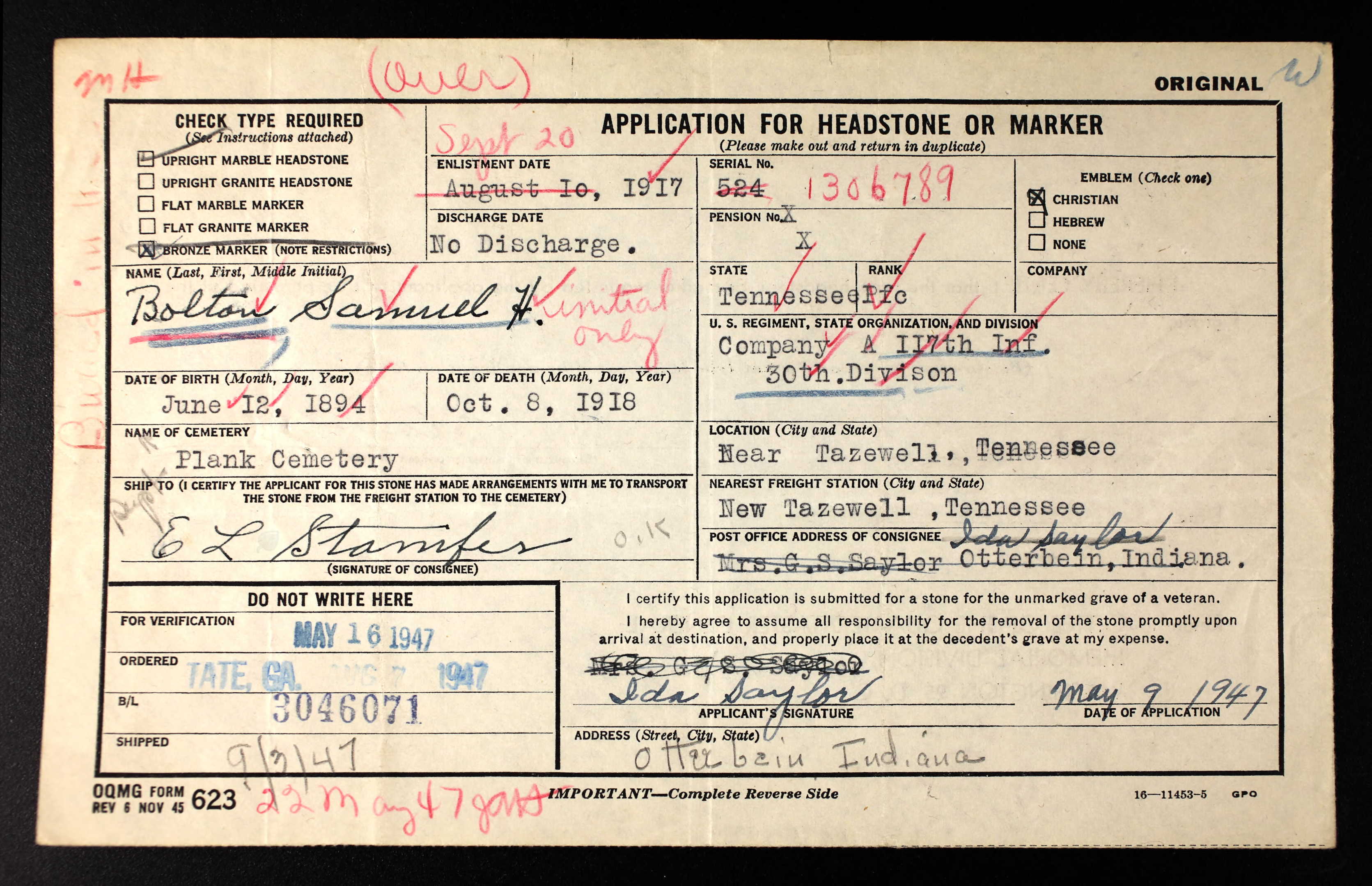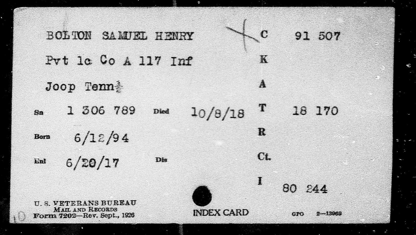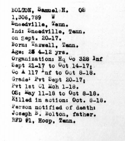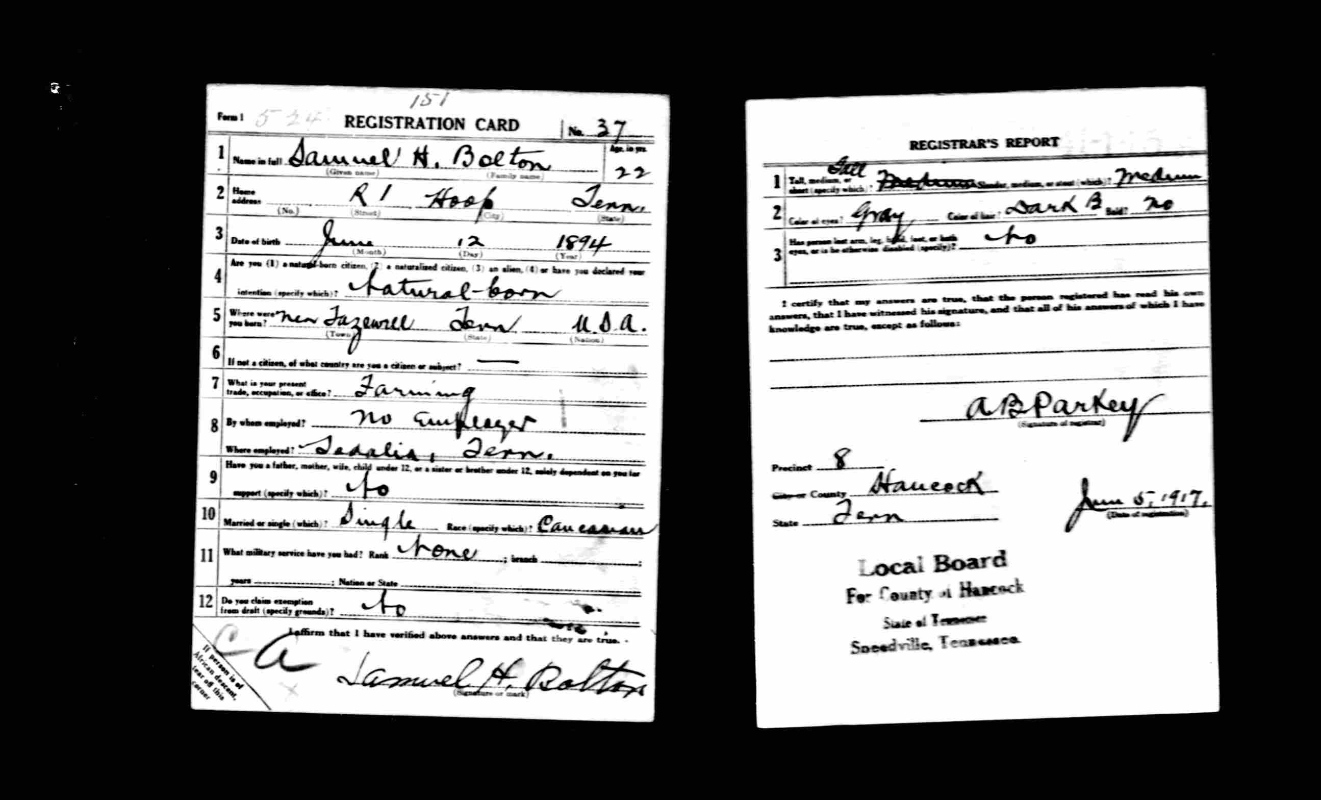 Samuel Henry Bolton was born 12 June 1894, New Tazewell, TN