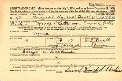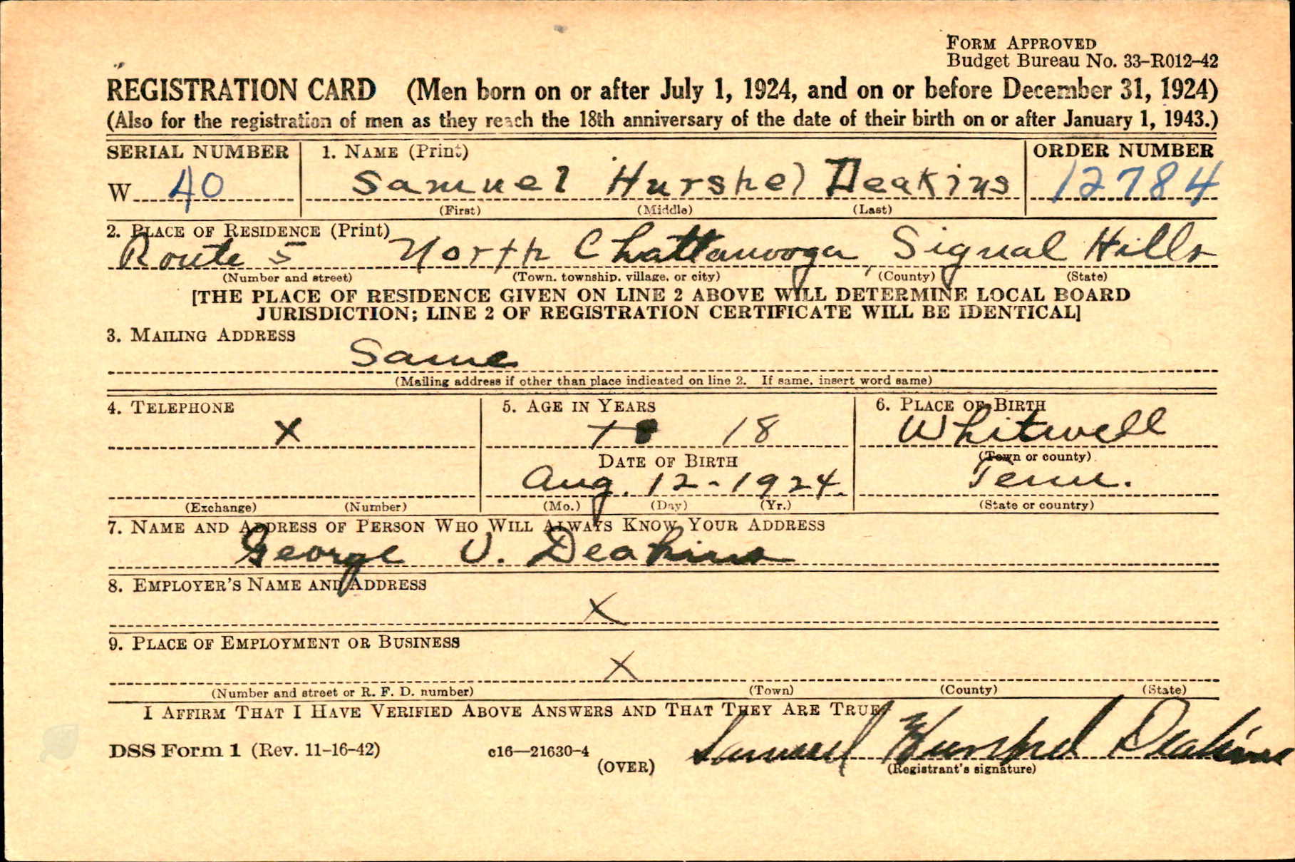 Samuel Hurshel Deakins was born on 12 August 1924 at Whitwell, Tennessee, the son of of George Venice Deakins and Beulah A. Hixson