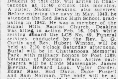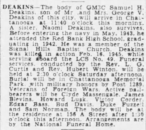 Reportyed killed in action was GM3C Samuel Hurshel Deakins, USN, son fo Mr. and Mrs. George V. Deakins of Signal Hill, killed in action Feb. 16 at Marivelles Bay near Corregidor when his ship was sunk. His family was informed of his death on May 5. His sister is Miss Naomi Deakins of Signal Hills. He entered the service in May, 1943, and was employed by the Simplicity System Company before he entered the service.