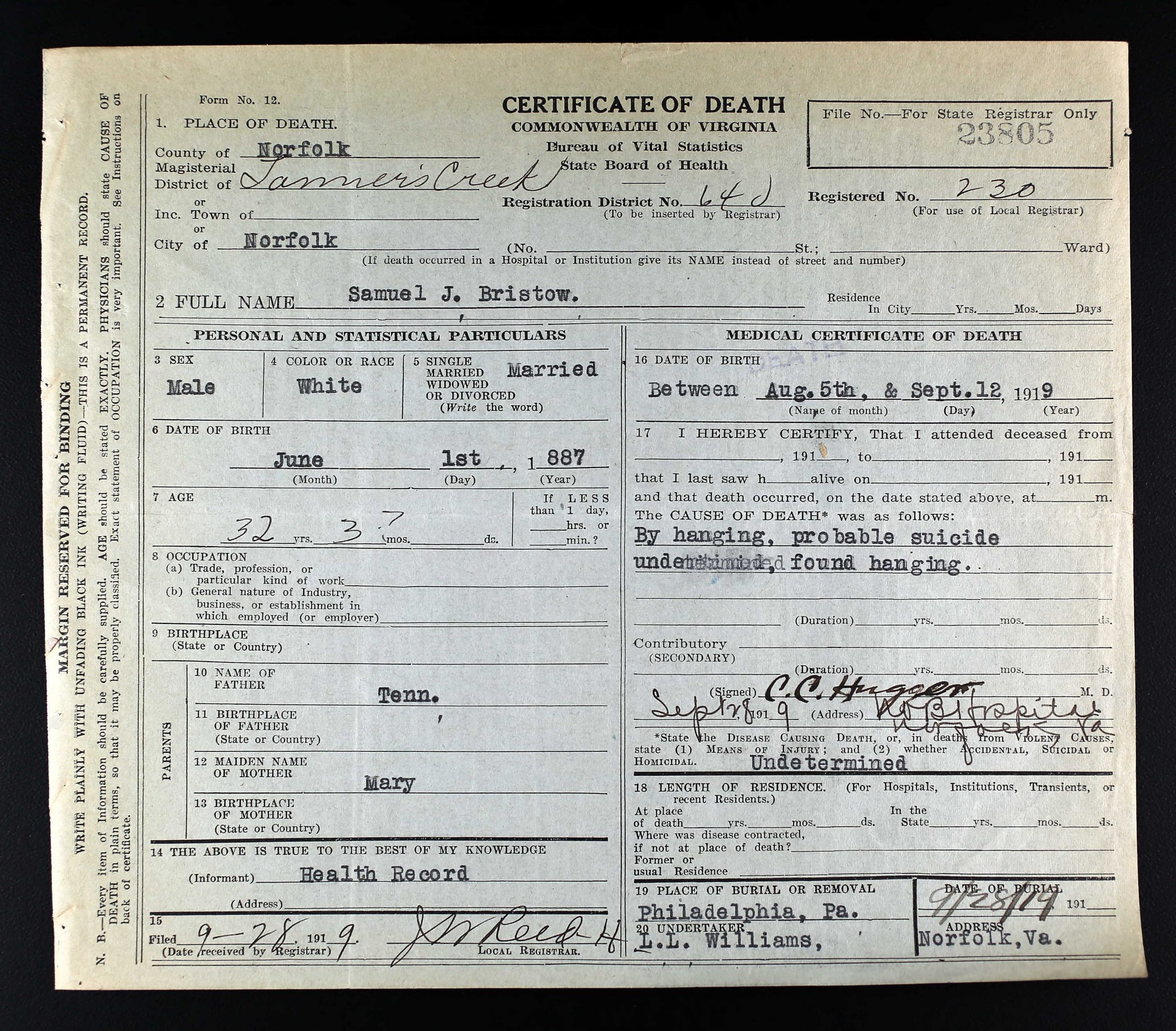 He was the son of Nathaniel Bristow and Mary Brown. Husband of Rosanne “Rose” Fox and father of Mary E. Bristow.
