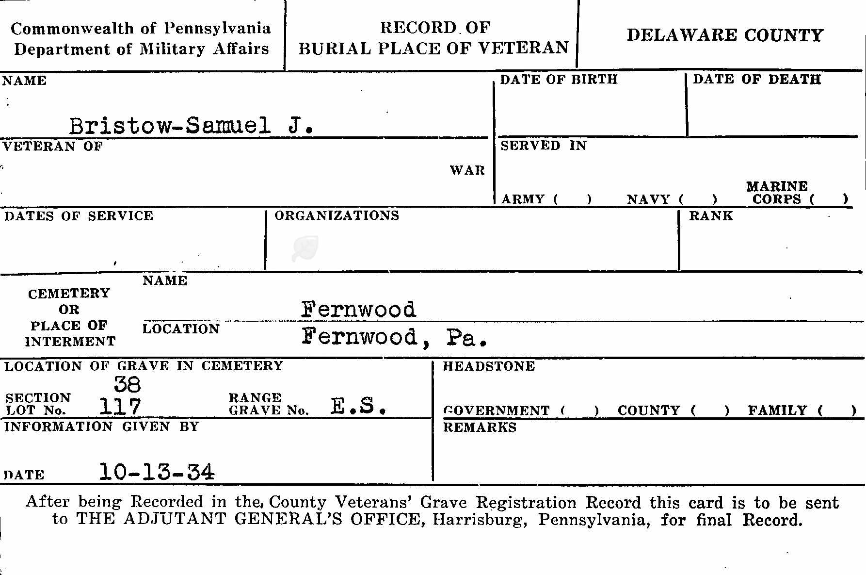 - Burial/Memorial Location: Fernwood Cemetery, Fernwood, Delaware County, Pennsylvania