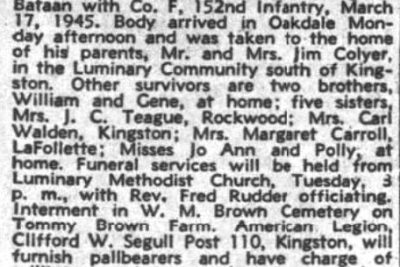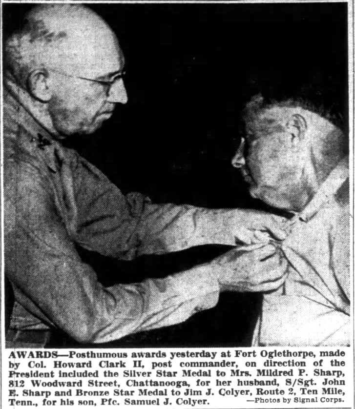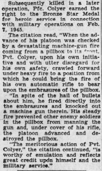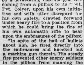 The citation read, “When the advance of his platoon was checked by a devastating machine-gun fire, coming from a pillbox to its front, Pvt. Colyer, upon his own initiative and with utter disregard for his own safety, crawled forward under heavy fire to a position from which he could bring the fire of his own automatic rifle to bear upon the embrasures of the pillbox. In spite of the hail of bullets about him, he fired directly into the embrasures and knocked out a machine gun therein. His steady fire prevented other enemy soldiers in the pillbox from manning the gun and, under cover of his rifle, the platoon advanced and destroyed the pillbox. The meritorious action of Pvt. Colyer, the citation continued, is worthy of emulation and reflects great credit upon himself and the military service.