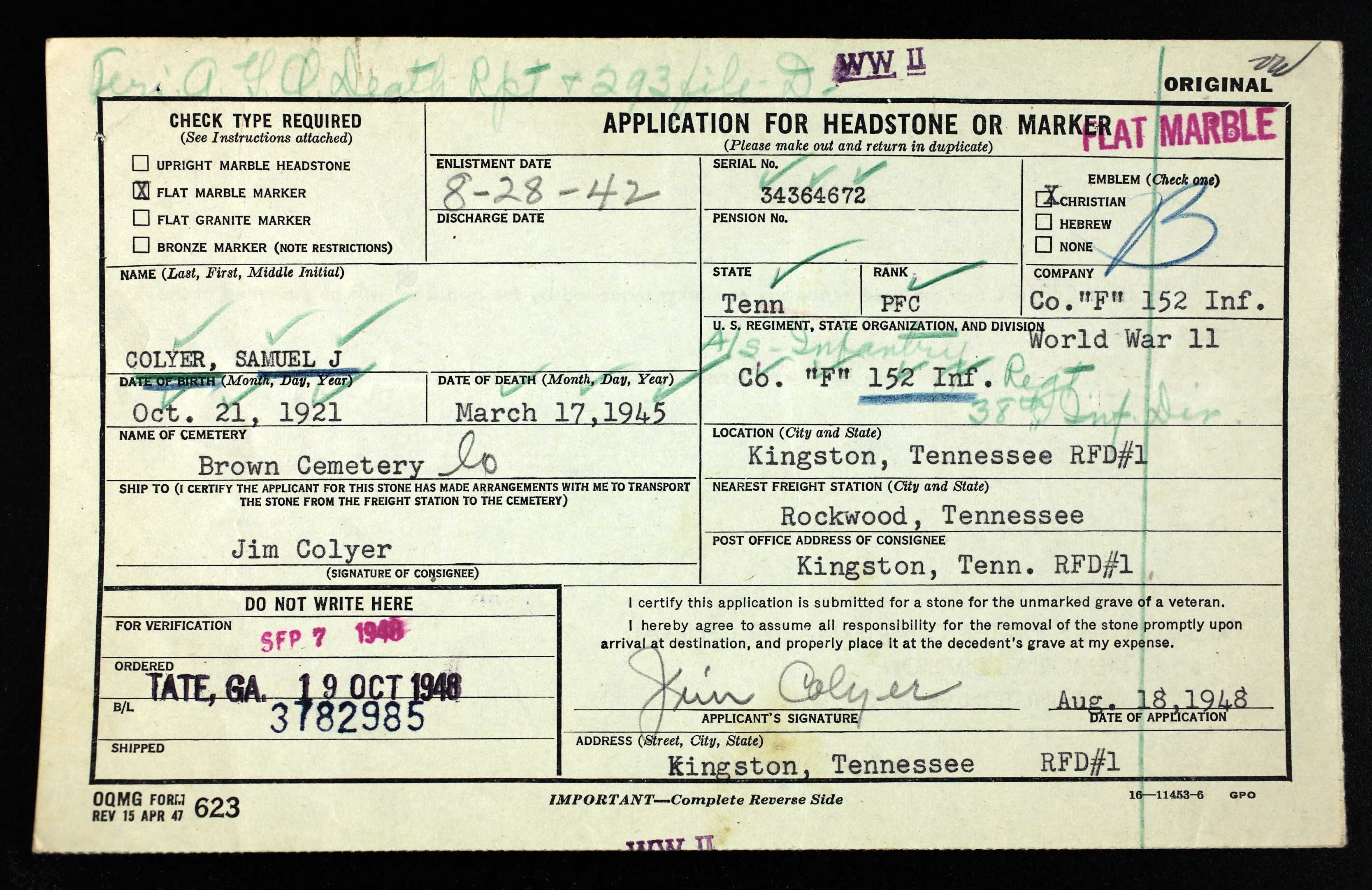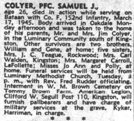 He enlisted on 14 August 1942 at Ft Oglethorpe, GA. He died in action while serving on Bataan with Company F, 152nd Division Infantry, 38th Infantry Division on March 17, 1945. He is buried in Brown Cemetery, Roane County, TN