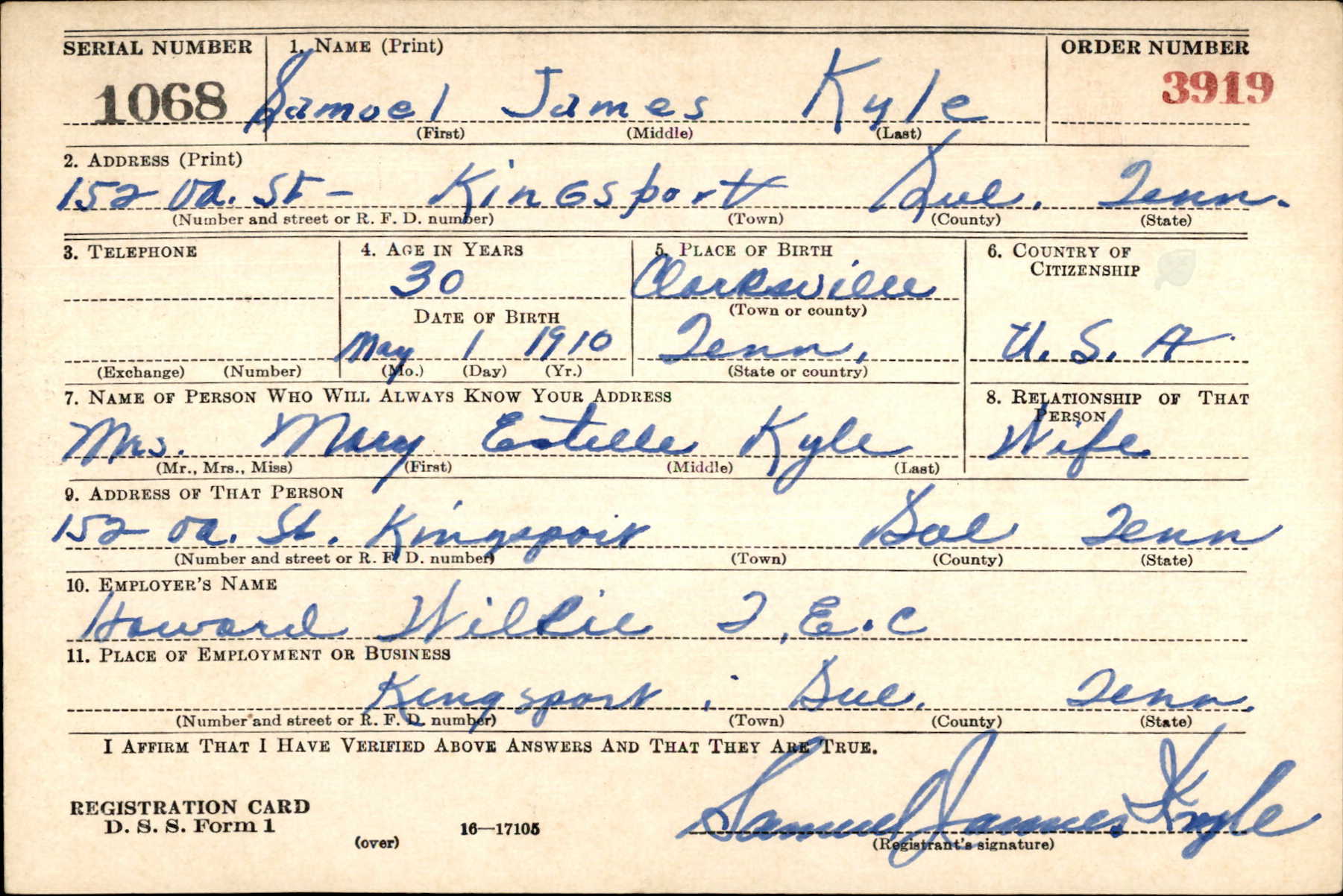 Samuel James Kyle was born on 1 May 1910. He was the son of William David Kyle and Vilas Hart. He was married to Mary Estill Pendleton and father of Louise Kyle.