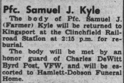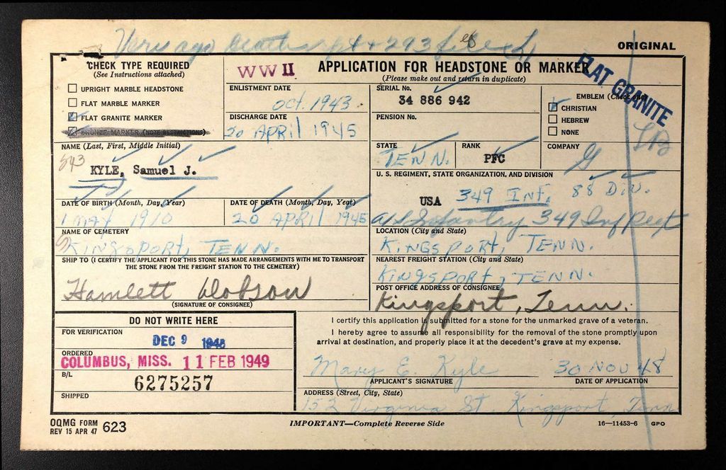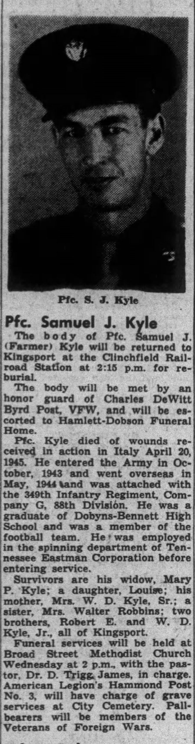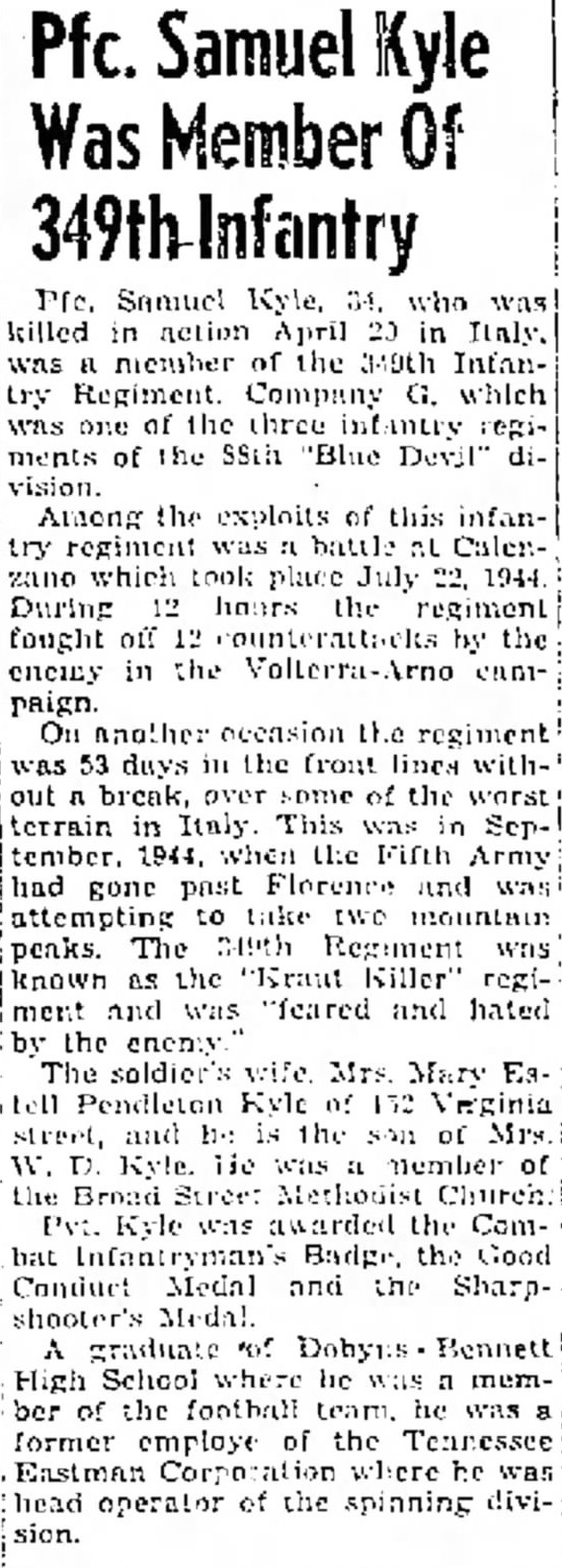 PFC Kyle, 34, who was killed in action April 20 in Italy, was a member of the 349th Infantry Regiment, Company G, which was one of the three infantry regiments of the 88th Blue Devil Division.