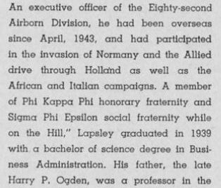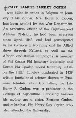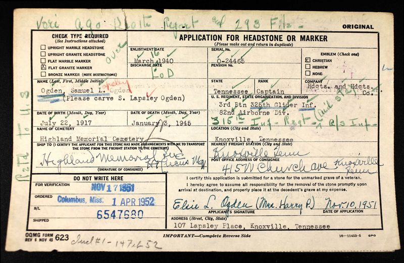 Captain Ogden served as officer in the 325th Glider Infantry Regiment, from 1940 until killed in action, January 3, 1945, while in Command of 3rd Battalion, 325th Glider Infantry Regiment. He participated in the landings in Africa, Sicily, Italy and Normandy. He was Killed In Action in Fontainebleau, Belgium in the Battle of the Bulge.