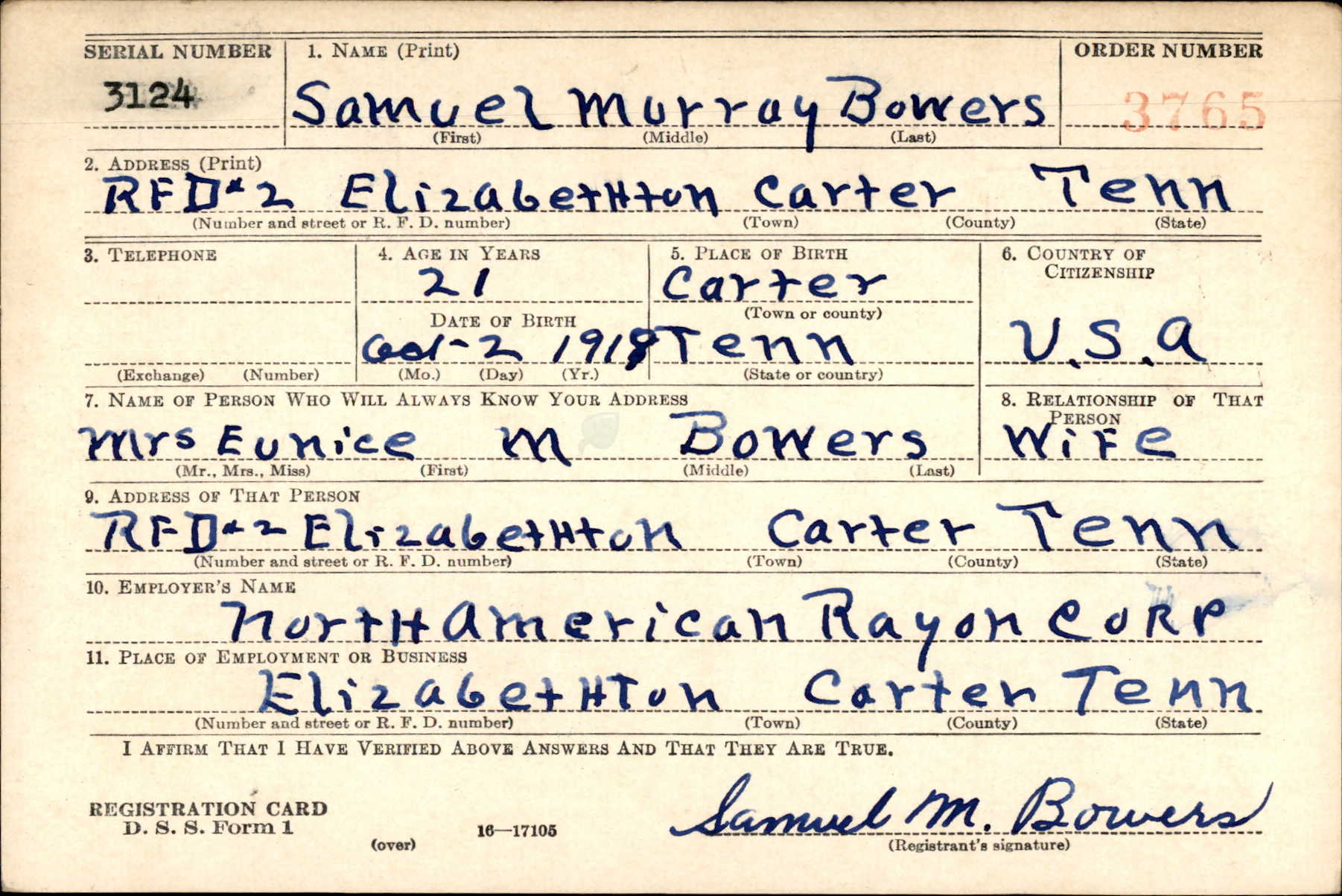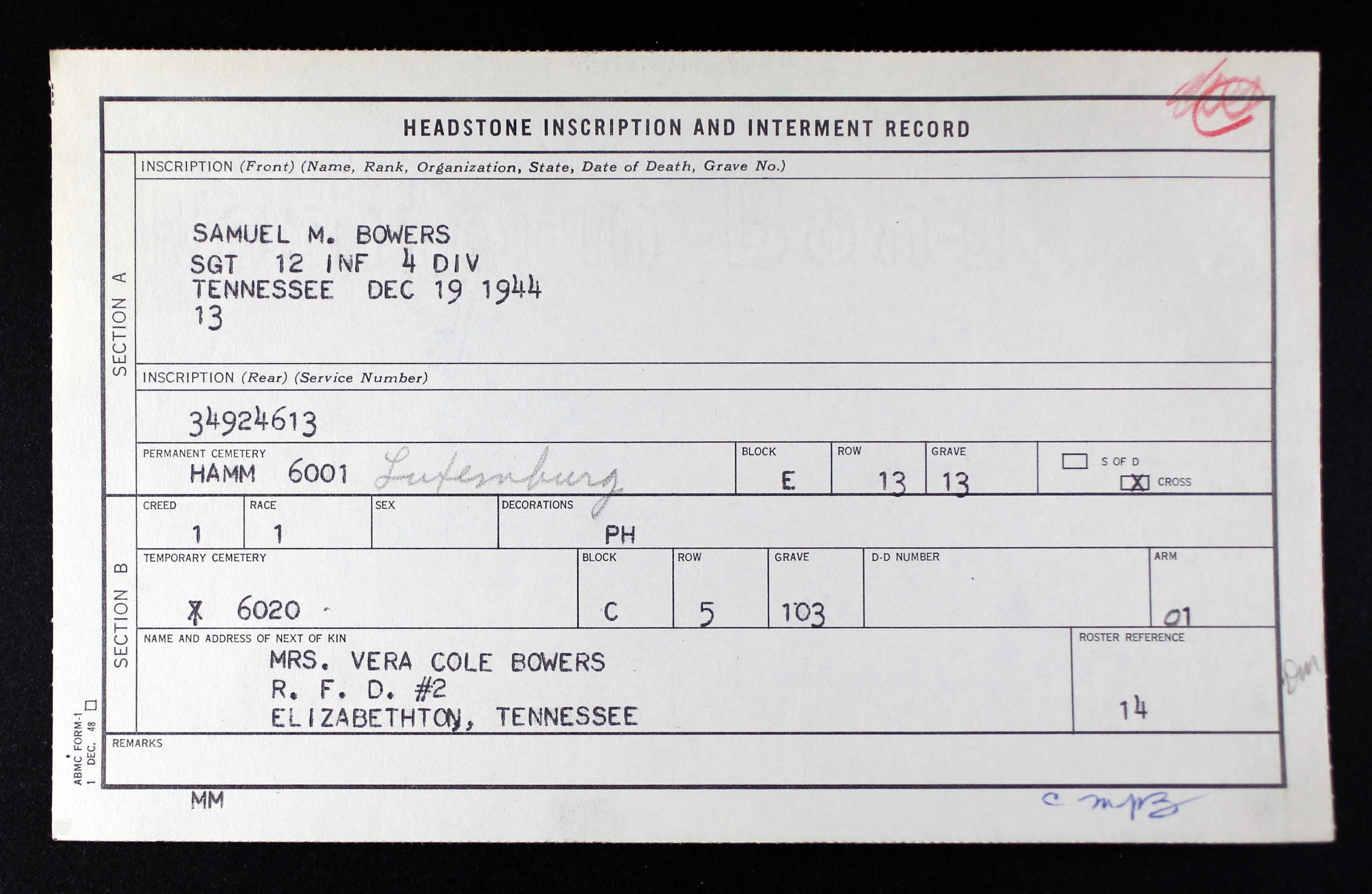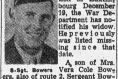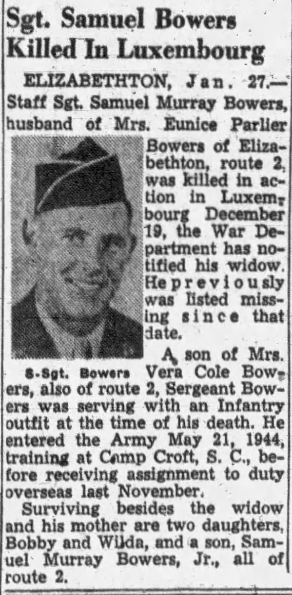 Elizabethton, Jan. 27 – Staff Sgt. Samuel Murray Bowers, husband of Mrs. Eunice Parlier Bowers of Elizabethton, route 2, was killed in action in Luxembourg December 19, the War Department has notified his widow. He previously was listed missing since that date. A son of Mrs. Vera Cole Bowers, also of route 2, Sergeant bowers was serving with an infantry outfit at the time of his death. He entered the Army May 21, 1944, training at Camp Croft, S.C., before receiving assignment to duty overseas last November. Surviving besides his widow and his mother are two daughters, Bobby and Wilda and a son, Samuel Murray Bowers, Jr., all of route 2.