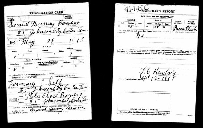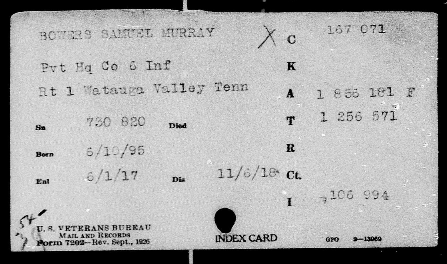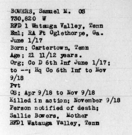 Samuel Murray Bowers was born on 28 May 1893 in Cartertown, Tennessee, son of Sallie Bowers.