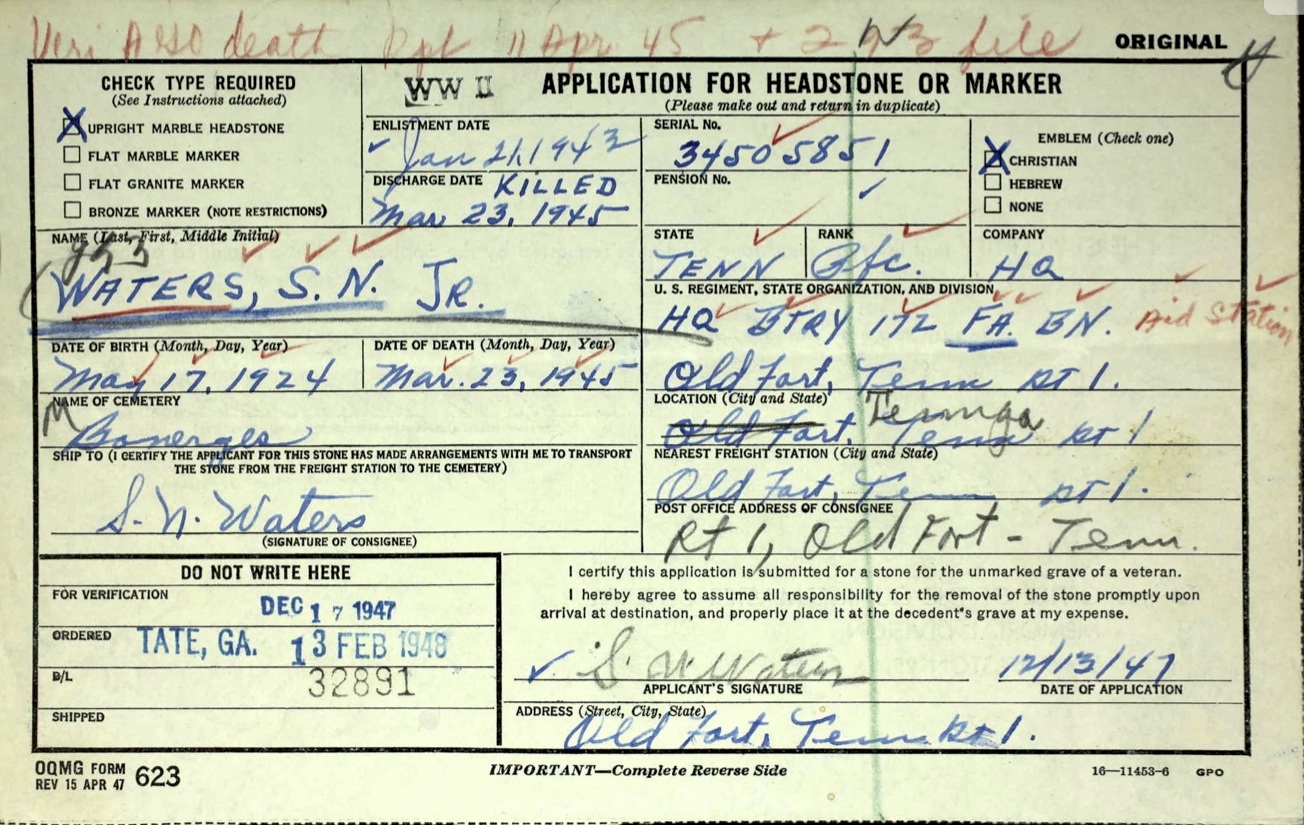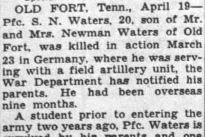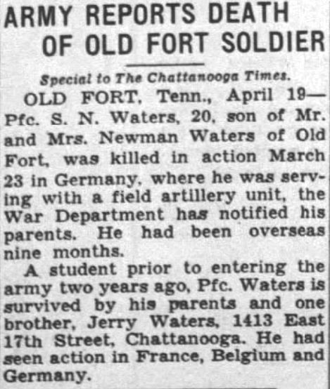 Pfc. S.N. Waters, 20, son of Mr. and Mrs. Newman Waters of Old Fort, was killed in action March 23 in Germany, where he was serving with a field artillery unit, the War Department has notified his parents. He had been overseas nine months. A student prior to entering the army two years ago, Pfc. Waters is survived by his parents and one brother, Jerry Waters, 1413 East 17th Street, Chattanooga. He had seen action in France, Belgium and Germany.