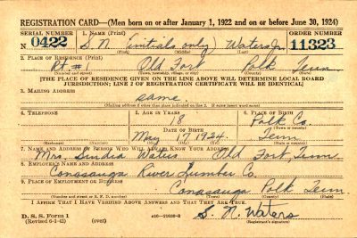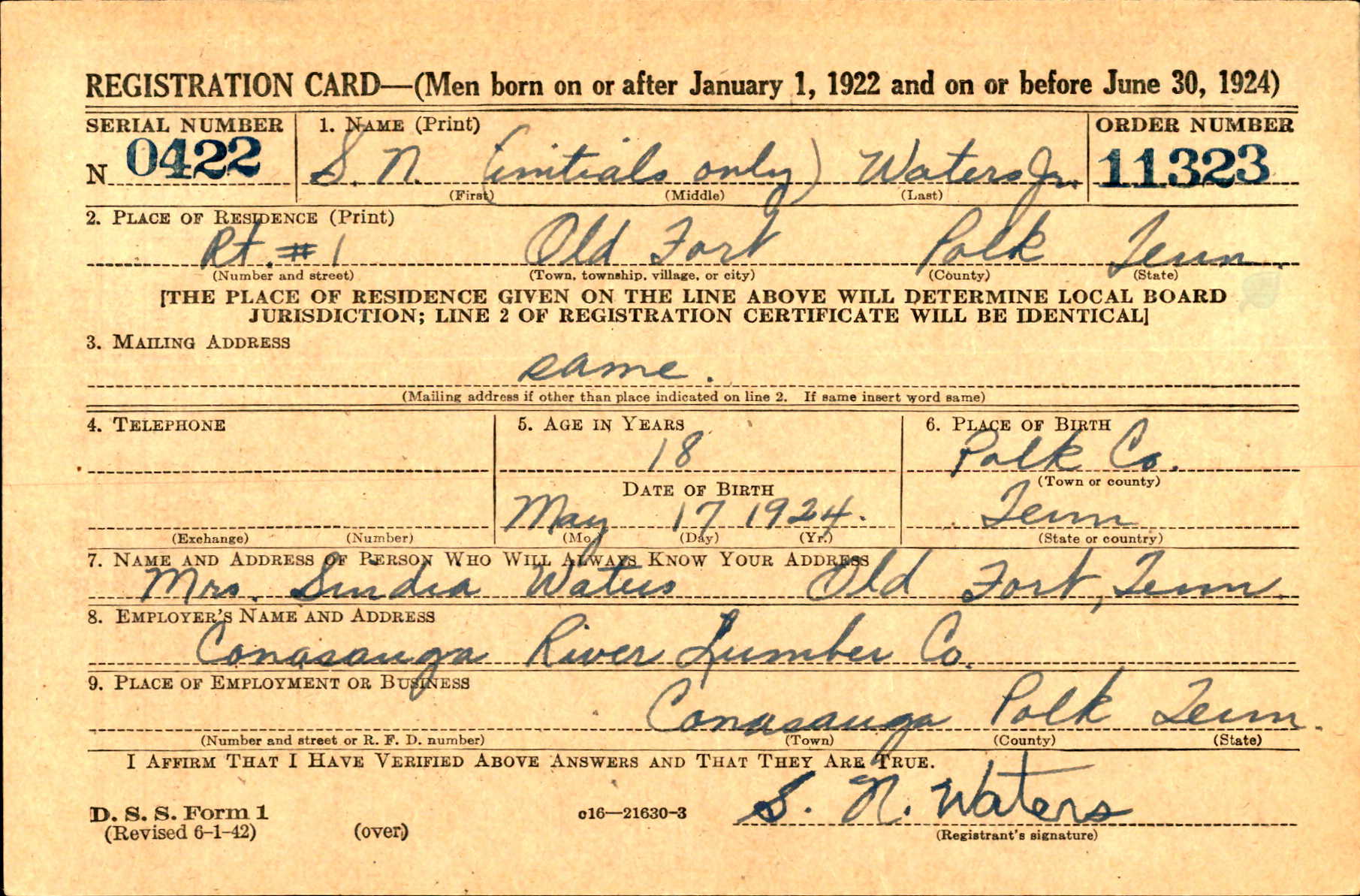 Samuel Newman (S.N.) Waters was born on 17 March 1924, Polk, Tennessee. He was the son of Samuel Newman Waters and Lucinda Harden