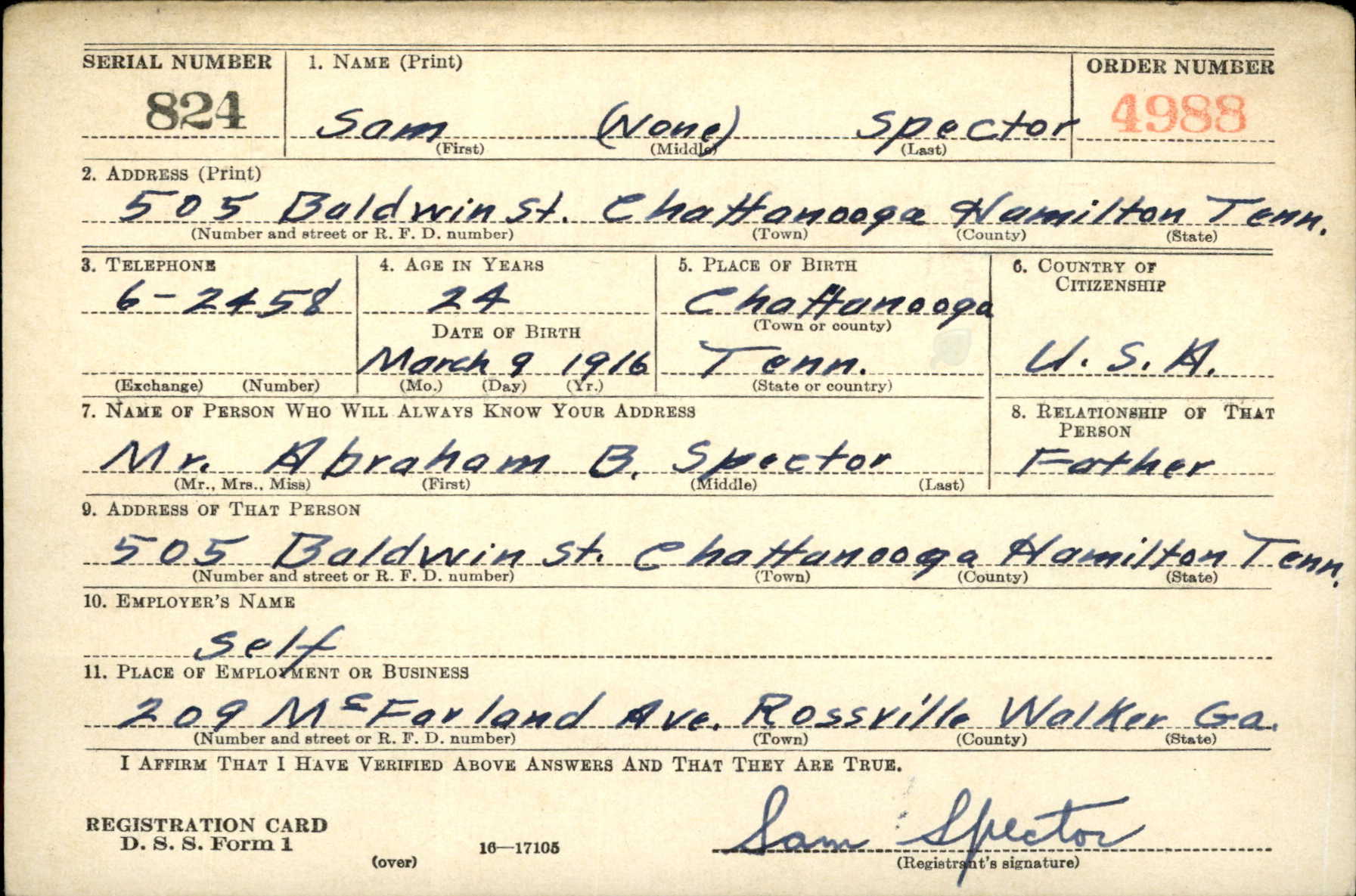 Samuel Spector was born in 1916 in Tennessee, son of Abraham Ben Spector and Ella Shier
