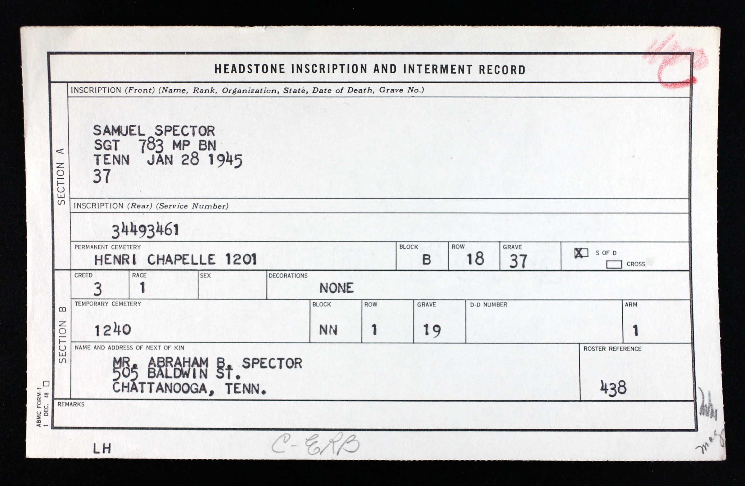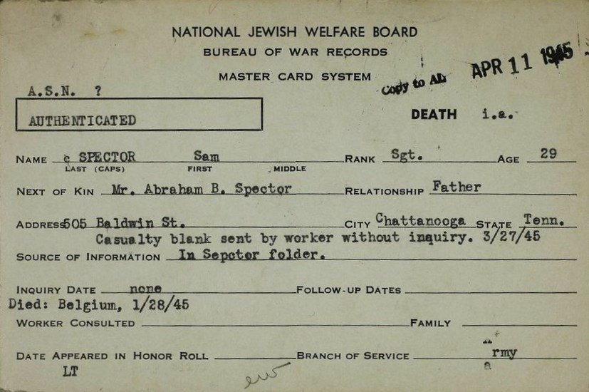 Sgt. Spector, former executive of the Chickamauga Laundry, Chickamauga, Ga., was reported killed in action Jan. 28 in Belgium. Serving with a military police detachment, he had been overseas since February, 1944. He is survived by his parents; three brothers, First Lt. Marvin L. Spector, with the 114th Infantry Division; Cpt. Mark A. Spector, stationed with an air force unit at Sioux Falls, S.d., and Lt. Joseph Spector, 20, now on duty at Fort Myers, Fla.