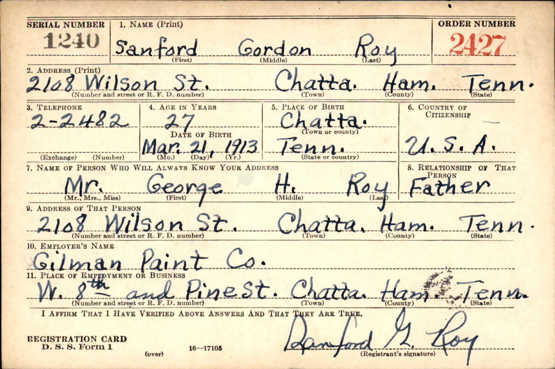 Sanford Gorden Roy was born at Chattanooga, Tennessee, the son of George Herbert Roy and Dora Rebecca Patton.