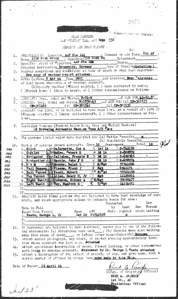 Aircraft B-24H with serial number 42-52185 was on an operational mission to Brunswick in Germany. The aircraft was hit by fighters at 1405 hours and crashed near Salzwedel in Germany.