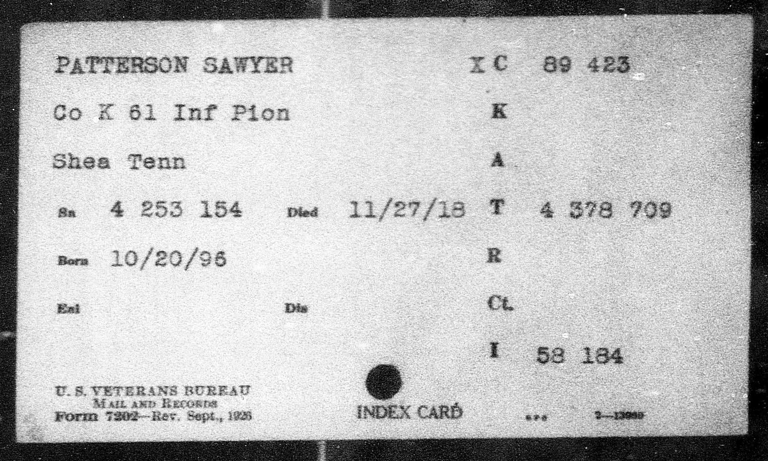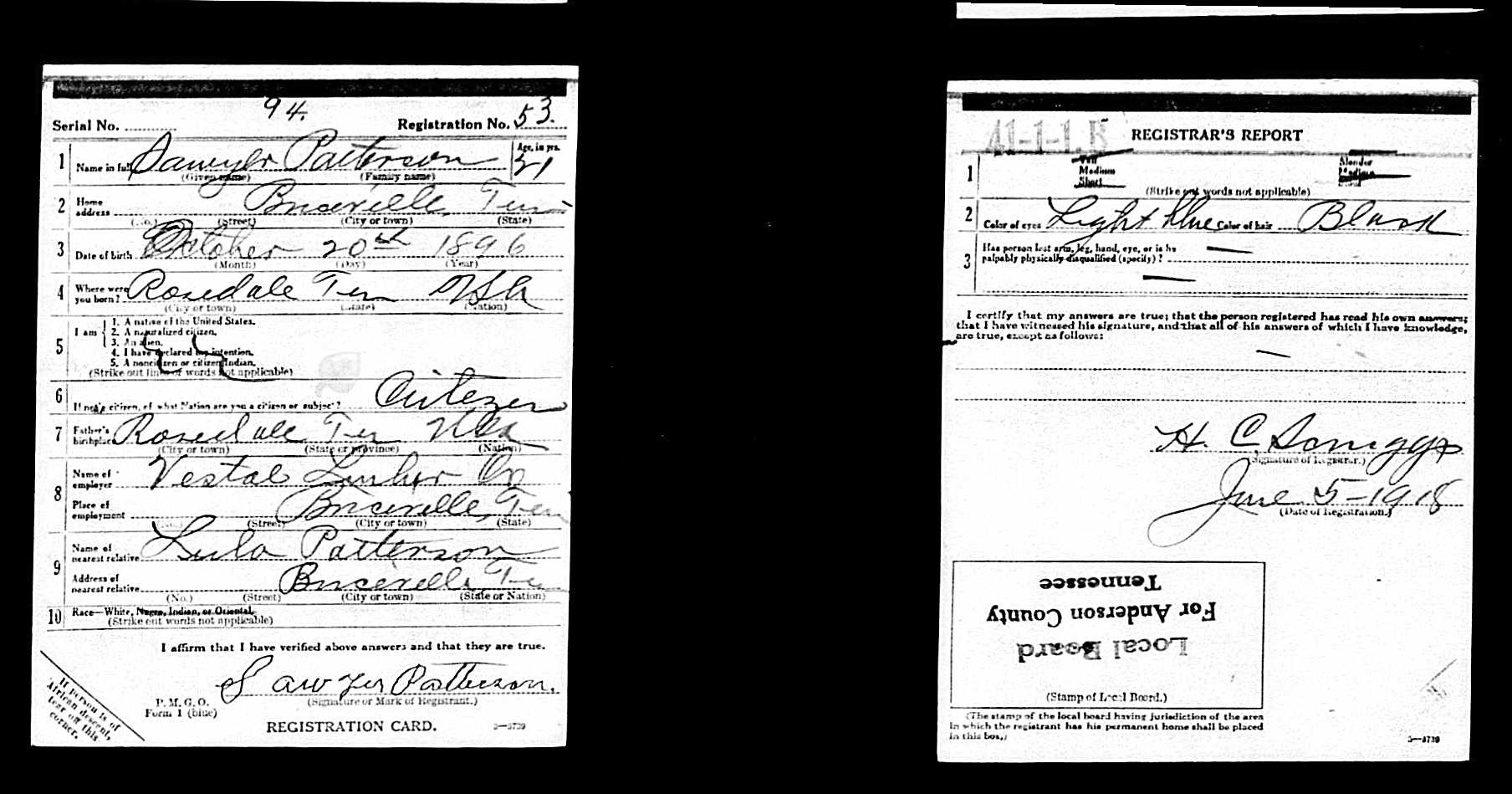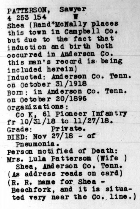 Sawyer Patterson was born on October 20, 1896 in Rosedale, Tennessee. Patterson, of Lake City, was the son of Matthew W. and Rosey J. Daugherty Patterson. He was the brother of Forester Patterson, Pearlie Patterson, Bertha Patterson, Foster Patterson, Mallie Patterson, Dorsey Patterson, and Della Patterson. He married Lula Bunch on March 3, 1916 in Anderson County. Prior to joining the military, he was employed by Vestal Lumber Company in Briceville, Tennessee.