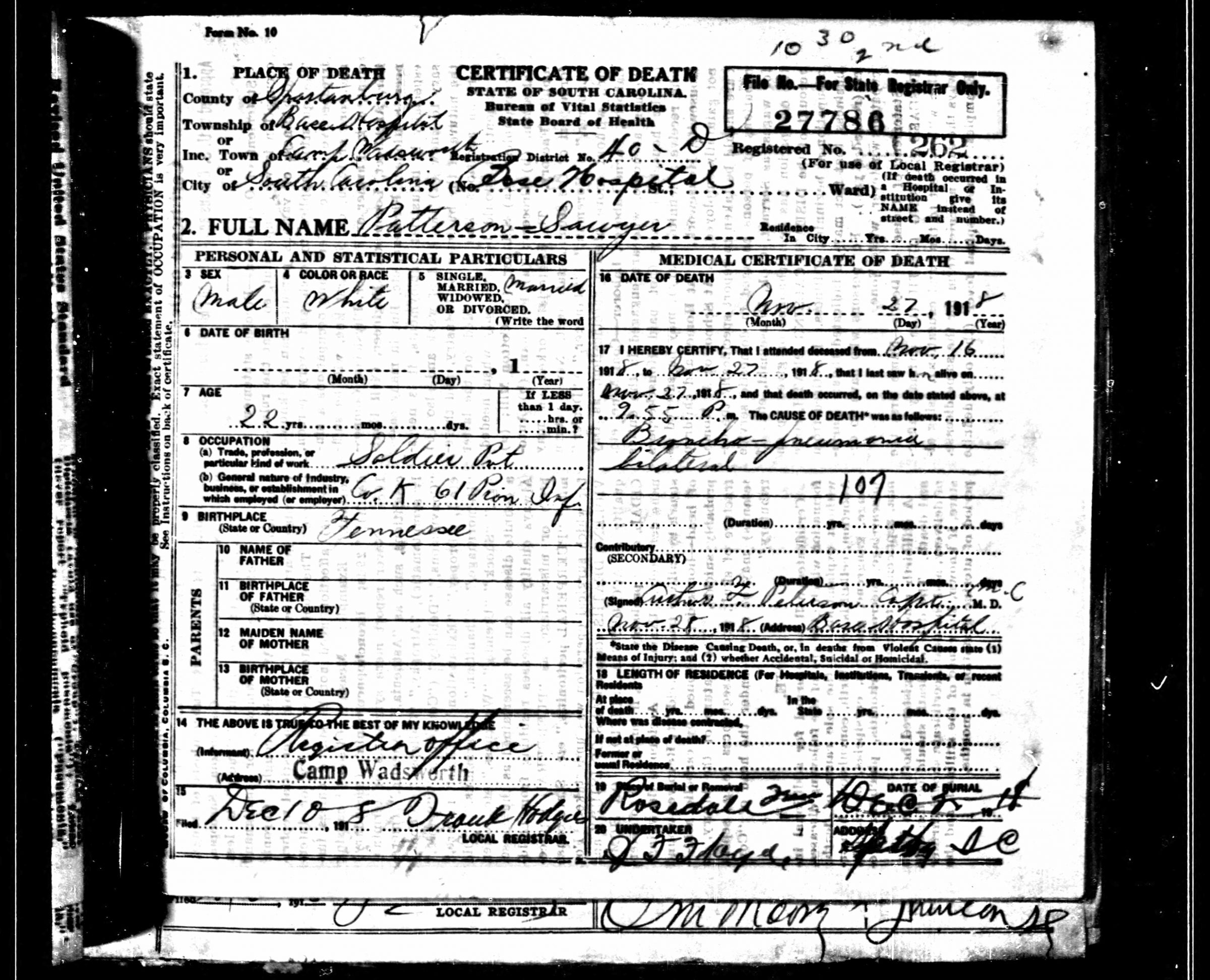 Pvt Patterson was admitted at the South Carolina Base Hospital at Spartanburg County on 16 November 1918 and died on 27 November of Bronchia Pneumonia. He is buried in Patterson Cemetery in Anderson County.