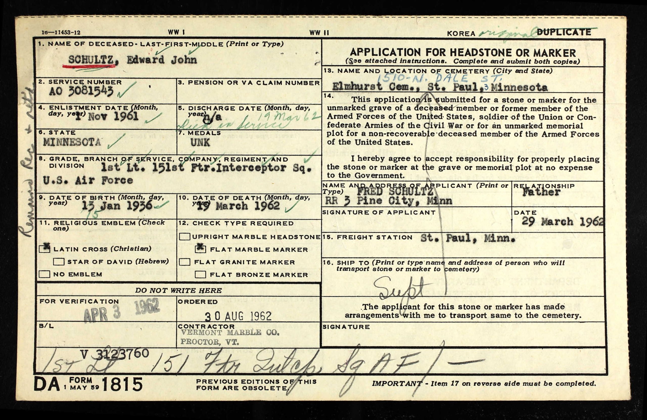 Lt. Schultz was killed on 19 March 1962 in a midair collision with another F-104.