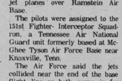 1st Lt. Edward J. Schultz, 26, formerly of 174 Sherburne Av., St. Paul, was one of two American jet fighter pilots killed in an air collision at Ramstein Air Base here Monday. The other was 1st Lt. James W. Ridout III, Ashland, Va. The collision occurred during a formation landing. A former student at the University of Minnesota, Lt. Schultz was a member of the 151st Fighter Interceptor Squadron, an Air National Guard unit from Knoxville, Tenn. Survivors include his parents, Mr. and Mrs. Fred Schultz, Pine City, Minn.; a brother, Donald, St. Paul, as well as a sister, Carol, residing in Sioux Falls, S.D.