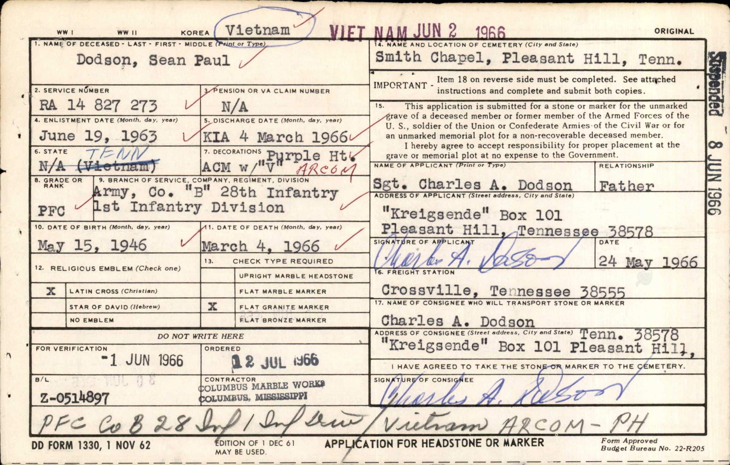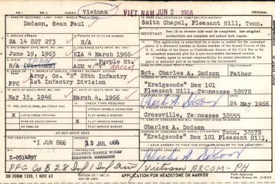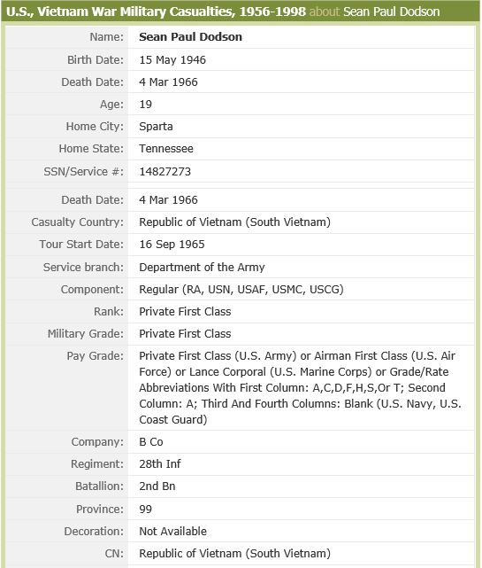 Private First Class Sean Paul Dodson was born on May 15, 1946, and was originally from Sparta, Tennessee. He served his country in the Vietnam War in the United States Army, as an infantryman in B Company, 2nd Battalion, 28th Infantry, 1st Infantry Division. His tour in Vietnam began on September 16, 1965. Nearly half of a year later, on March 4, 1966, PFC Dodson was killed while under hostile conditions in Binh Duong province, South Vietnam; he was nineteen years old at the time of his death. PFC Dodson is memorialized on the Vietnam Veterans Memorial on Panel 5E, Line 101.