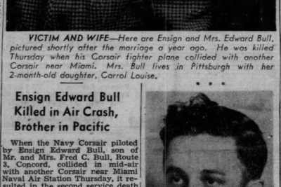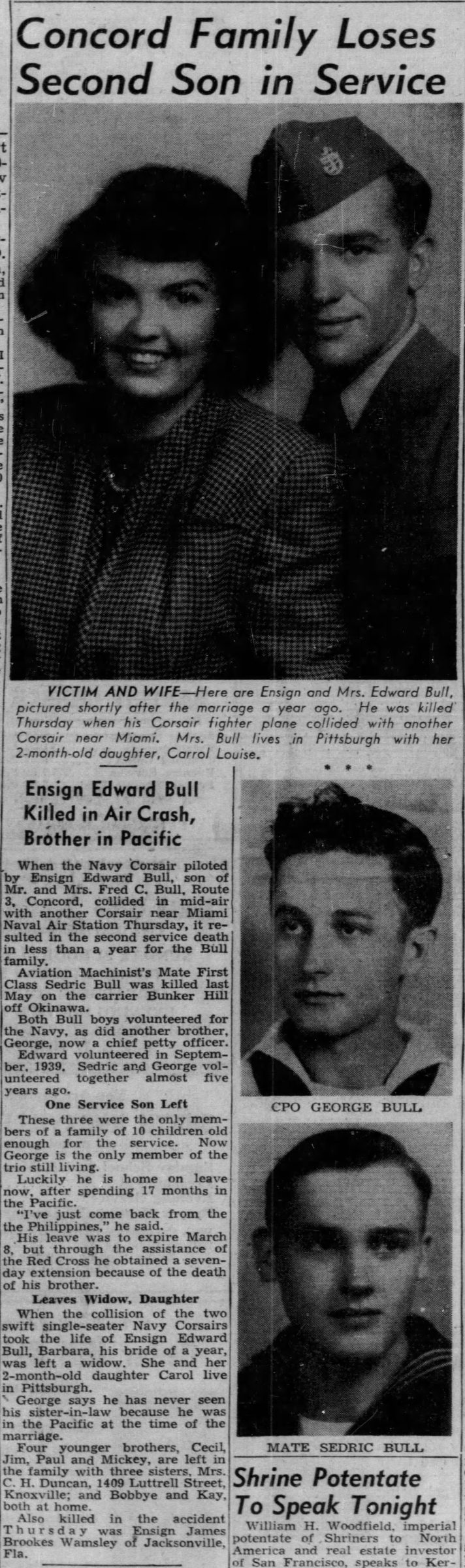 When the Navy Corsair piloted by Ensign Edward Bull, son of Mr. and Mrs. Fred C. Bull, Route 3, Concord, collided in mid-air with another Corsair near Miami Naval Air Station Thursday, it resulted in the second service death in less than a year for the Bull family. Aviation Machinist Mate First Class Sedric Bull was killed last May on the carrier Bunker Hill off Okinawa. Both Bull boys volunteered for the Navy, as did another brother, George, now a chief petty officer. Edward volunteered in September, 1939, Sedric and George volunteered together almost five years ago.