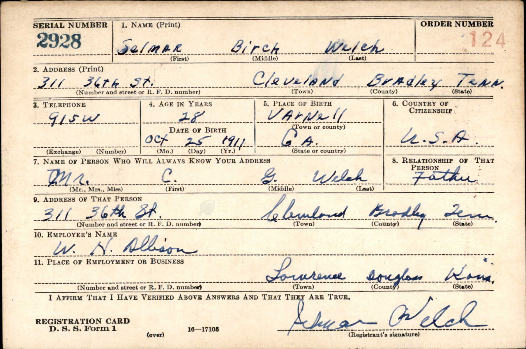 Selmar Birch Welch was born in Varnell, Georgia to Charles Gaut Welch and Agatha Esther Willborn. His brother Wallace Harold Welch died in Italy in 1944 and is buried at the Sicily-Rome American Cemetery in Italy.
