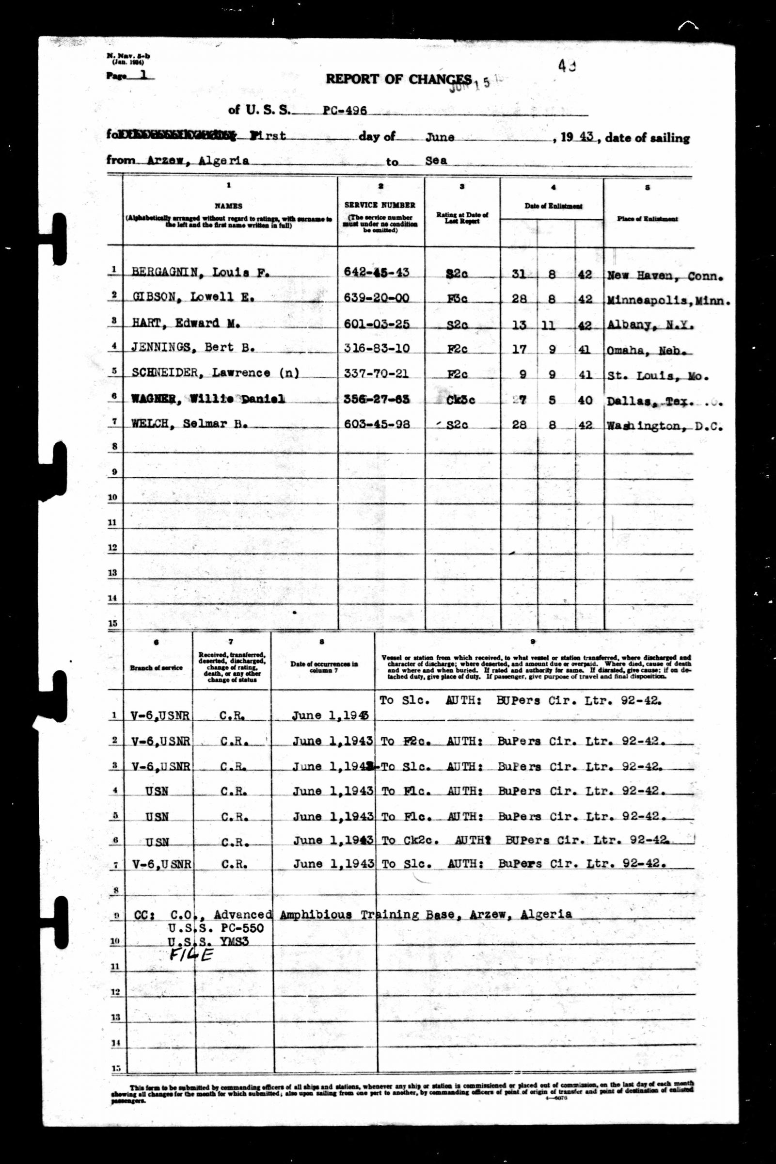 S1C Welch served on the U.S.S. PC-496 and is memorialized at North Africa American Cemetery, Carthage, Tunisia