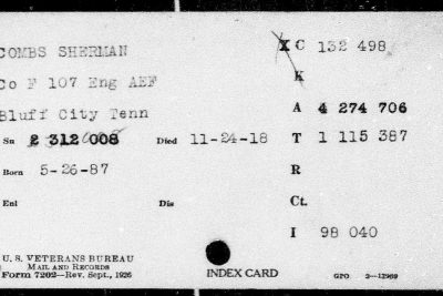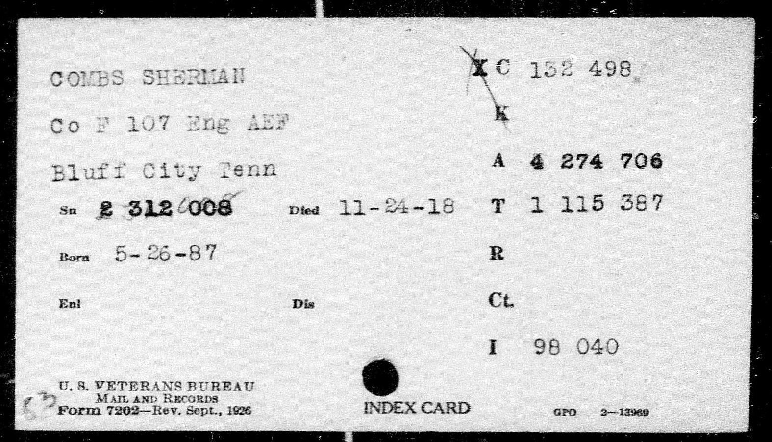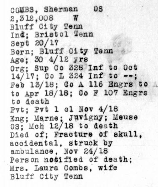Sherman Combs was born 26 May 1887 in Bluff City, Tennessee to William W. Combs and Emma Jane Harkleroad. Husband of Launa Combs. Father of J. Sherman Combs Jr. He died 24 November 1918 of a fracture to the skull after he was accidental struck by an ambulance.