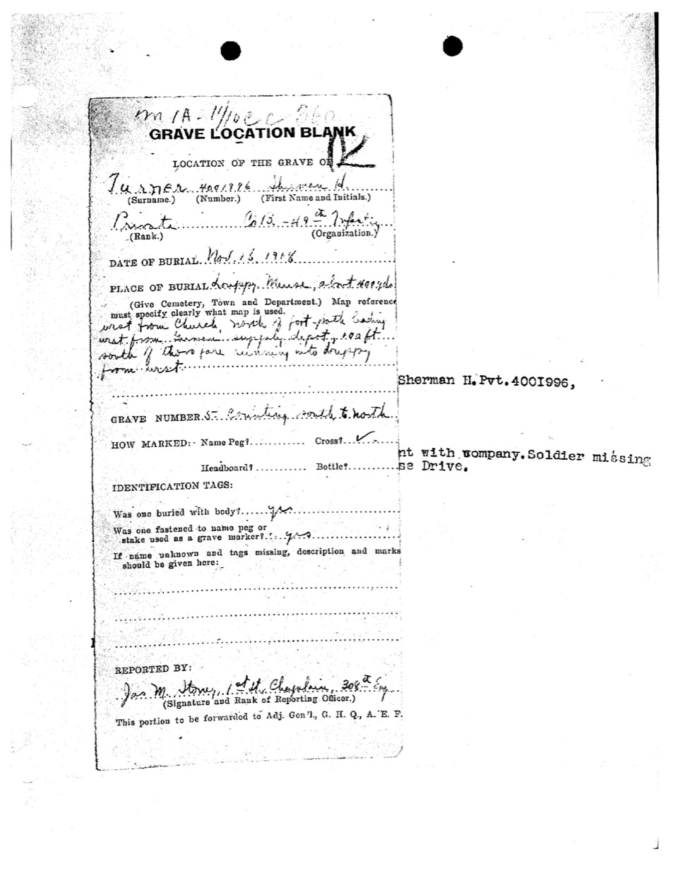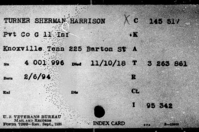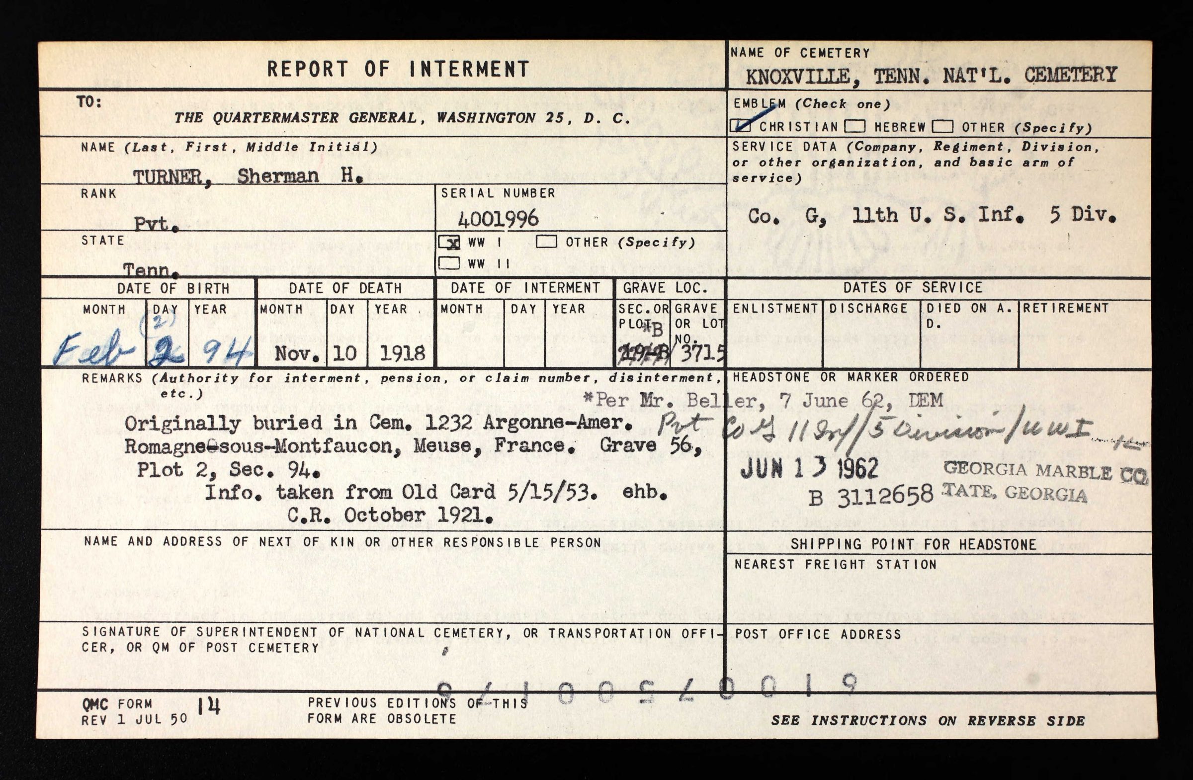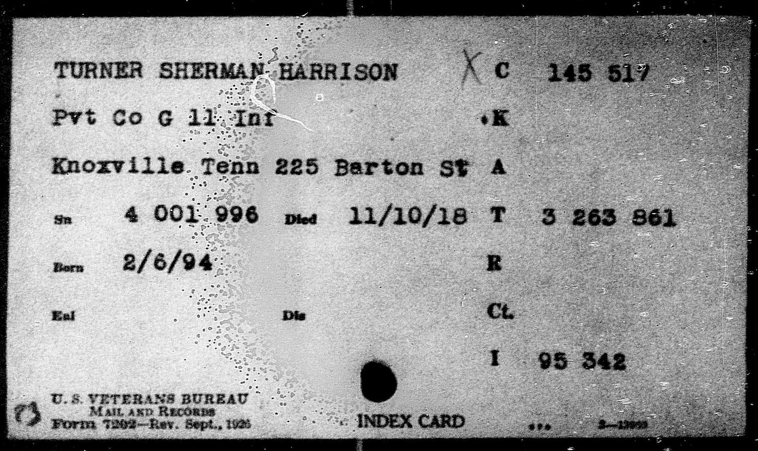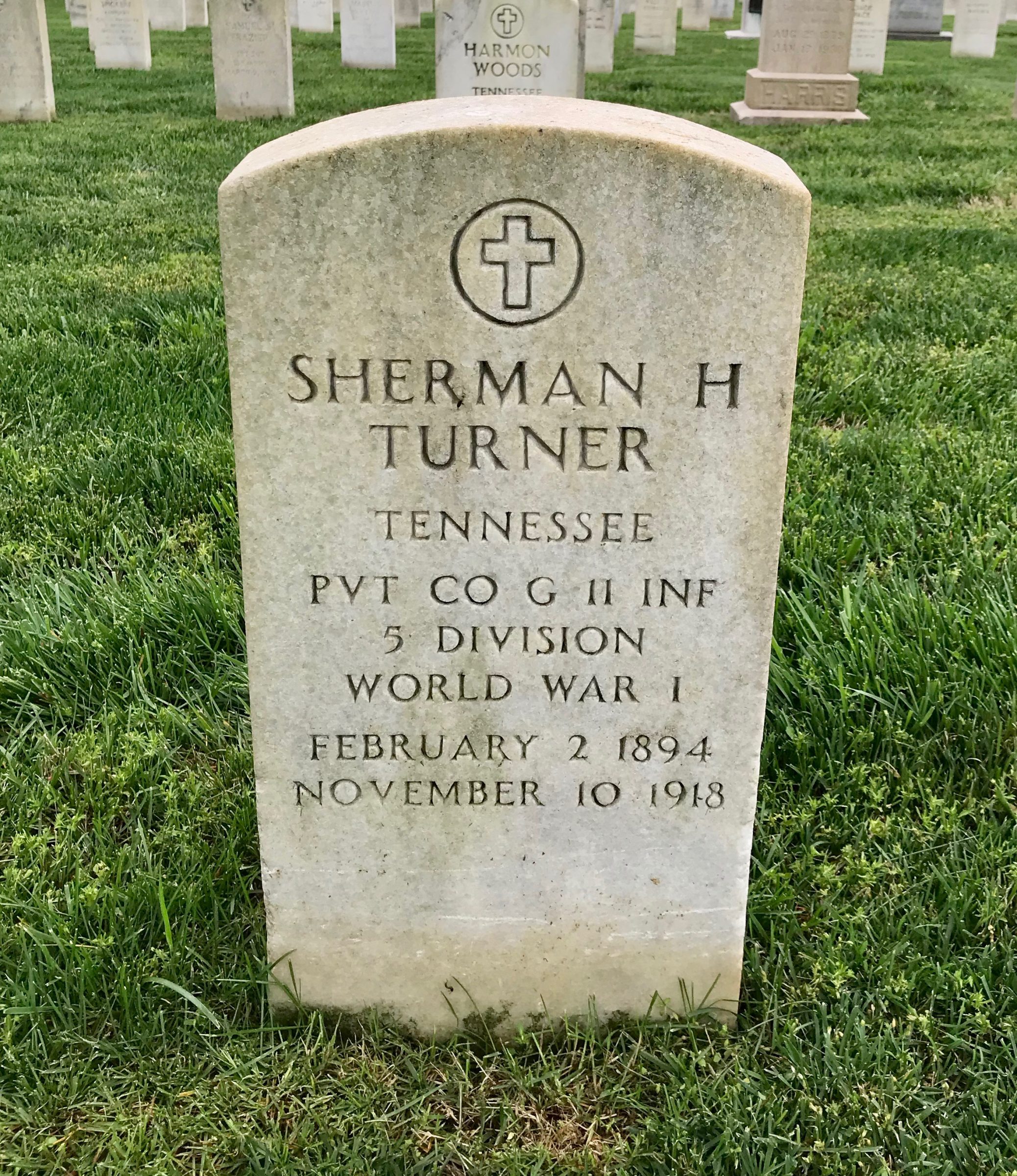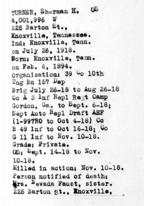 Sherman Harrison Turner was born in 1894 in Knoxville, Tennessee. He began his military career in August 1918 as a member of Company B, 49th Infantry. Later transferred to Company G, 11th Infantry. Sailed from New York for overseas duty on September 14, 1918. He was killed by an artillery shell in Louppy-sur-Loison, France along with five other soldiers, including fellow East Tennessean Henry S. Wilson on November 10, 1918, in Argonne-Meuse battle. They all died instantly.