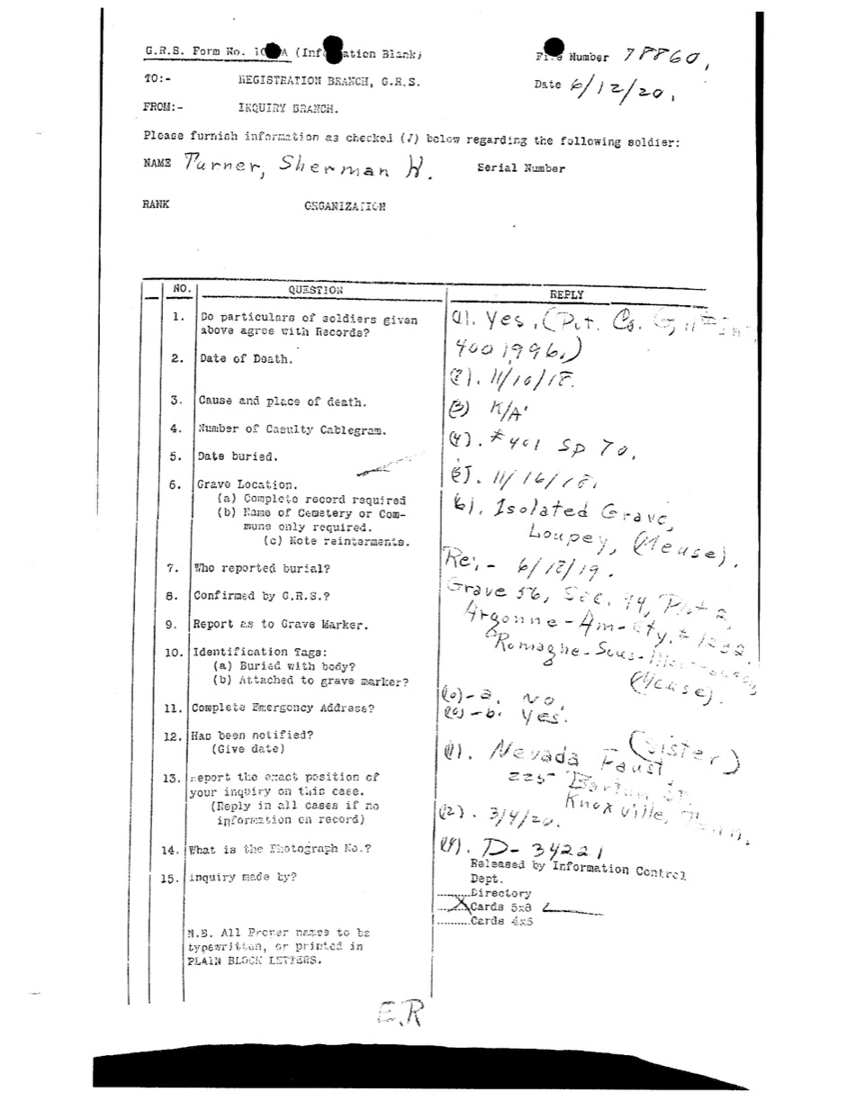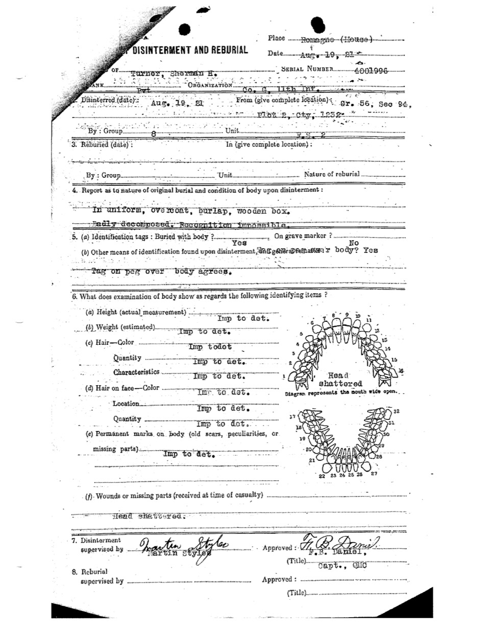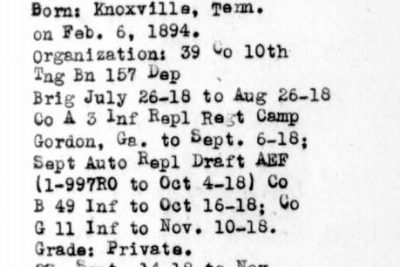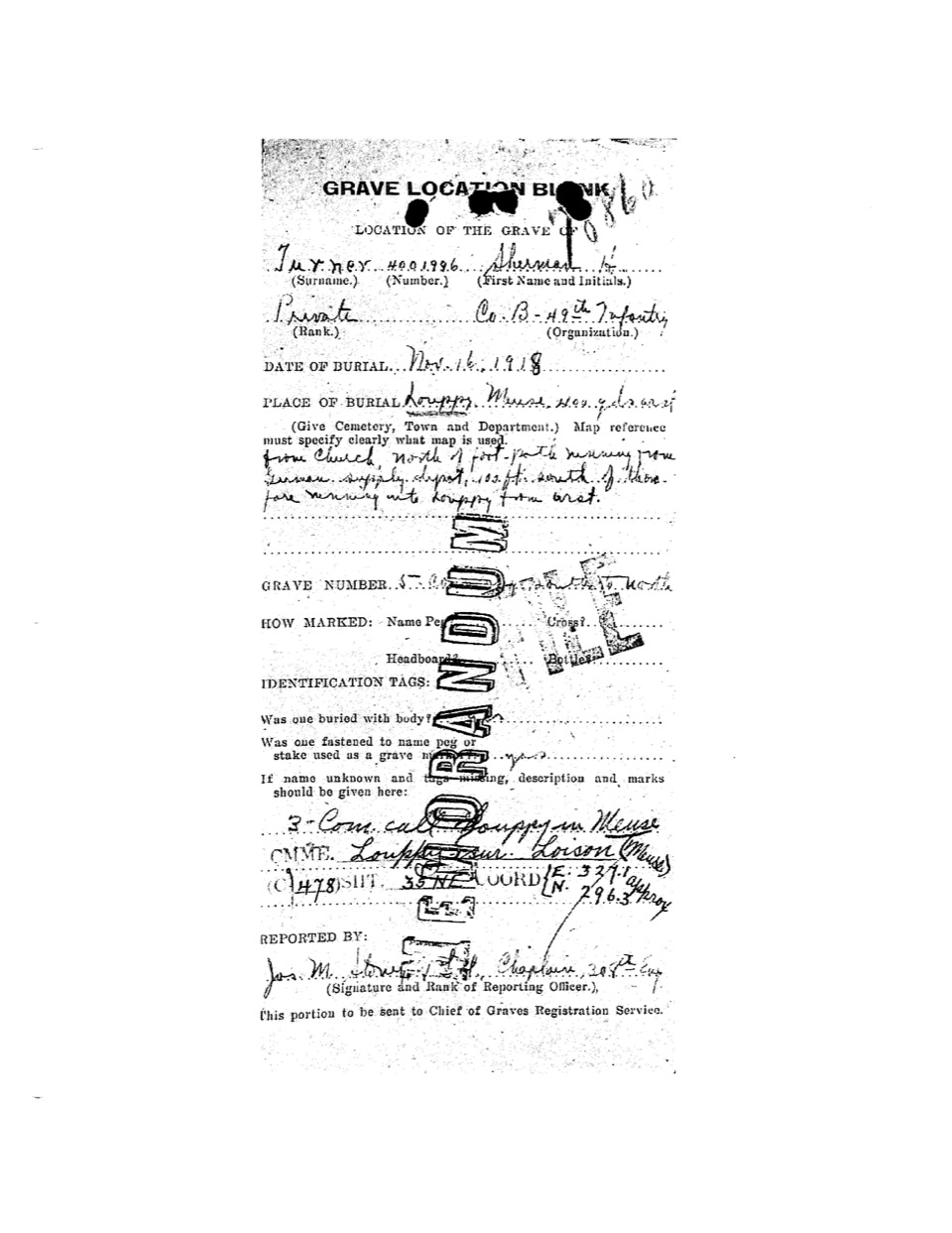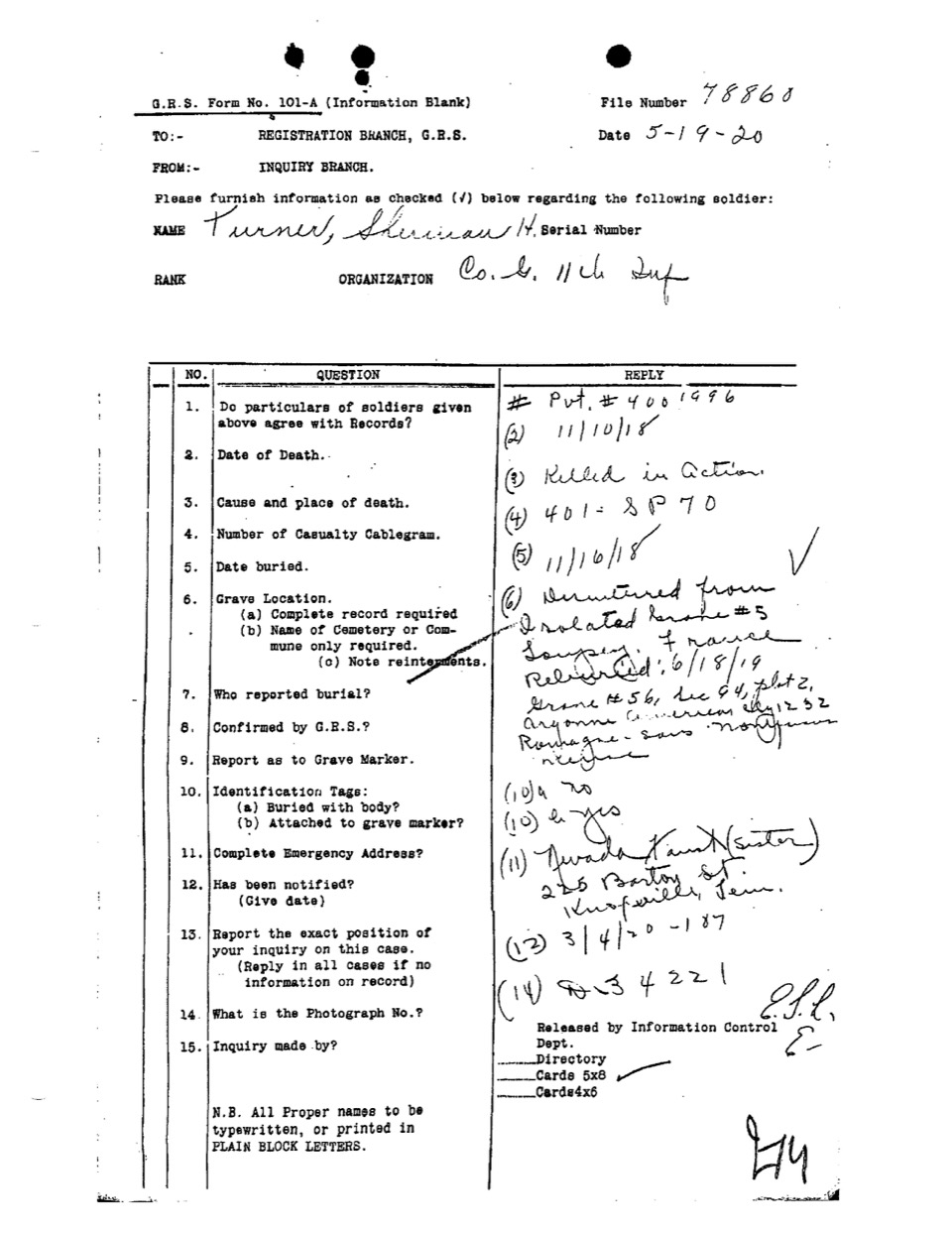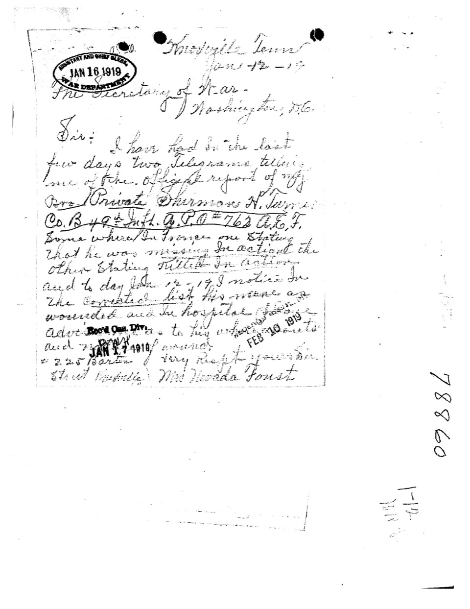 Sherman Harrison Turner was born in 1894 in Knoxville, Tennessee. He began his military career in August 1918 as a member of Company B, 49th Infantry. Later transferred to Company G, 11th Infantry. Sailed from New York for overseas duty on September 14, 1918. He was killed by an artillery shell in Louppy-sur-Loison, France along with five other soldiers, including fellow East Tennessean Henry S. Wilson on November 10, 1918, in Argonne-Meuse battle. They all died instantly.