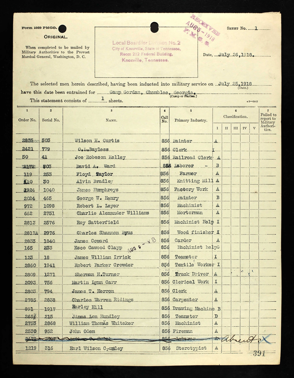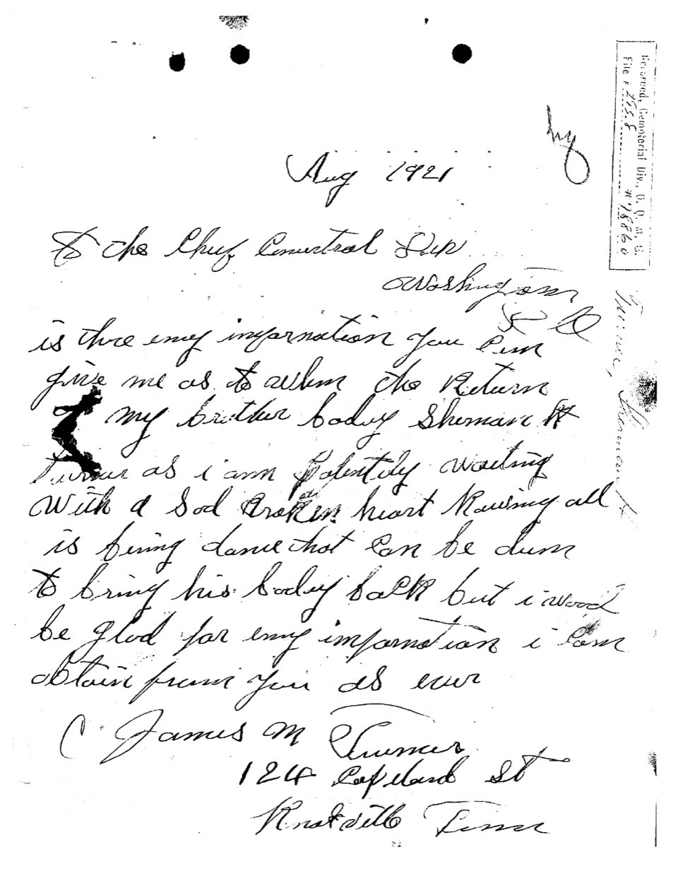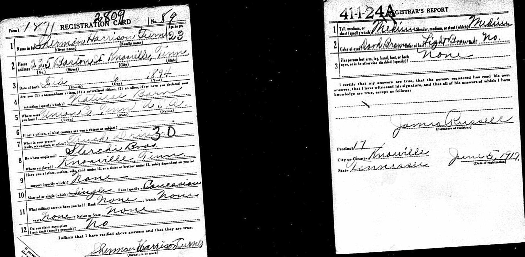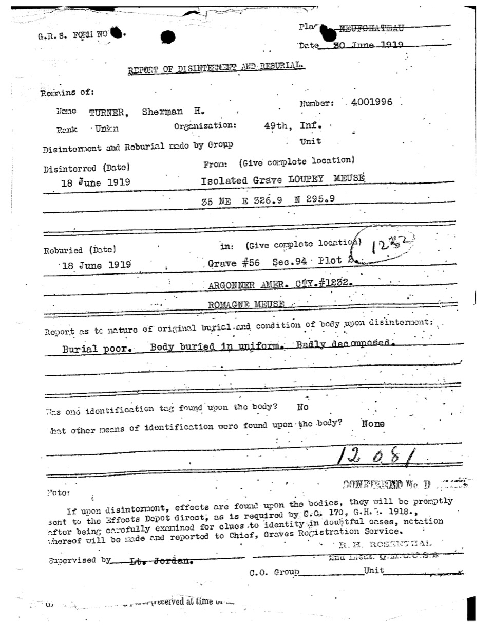 Sherman Harrison Turner was born in 1894 in Knoxville, Tennessee. He began his military career in August 1918 as a member of Company B, 49th Infantry. Later transferred to Company G, 11th Infantry. Sailed from New York for overseas duty on September 14, 1918. He was killed by an artillery shell in Louppy-sur-Loison, France along with five other soldiers, including fellow East Tennessean Henry S. Wilson on November 10, 1918, in Argonne-Meuse battle. They all died instantly.