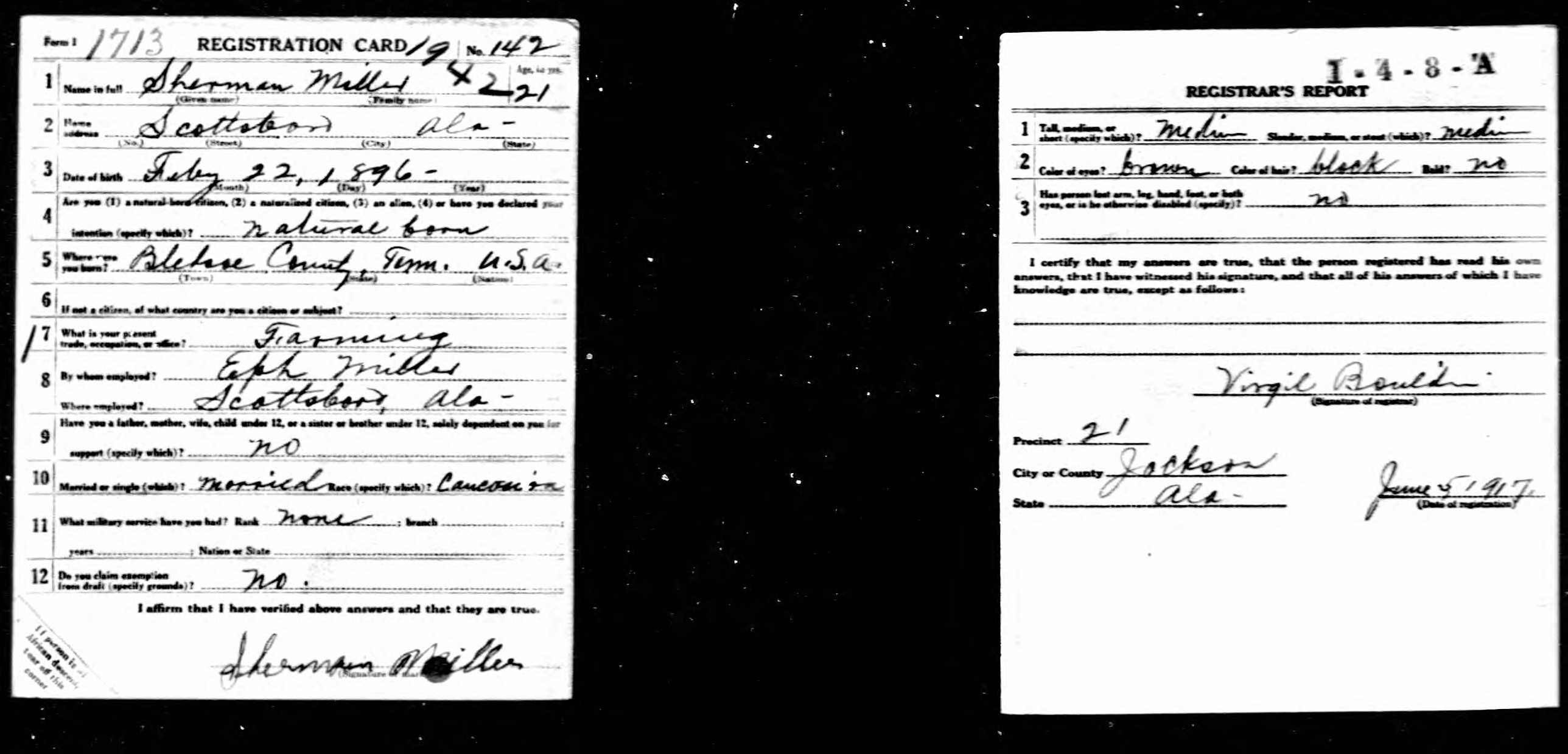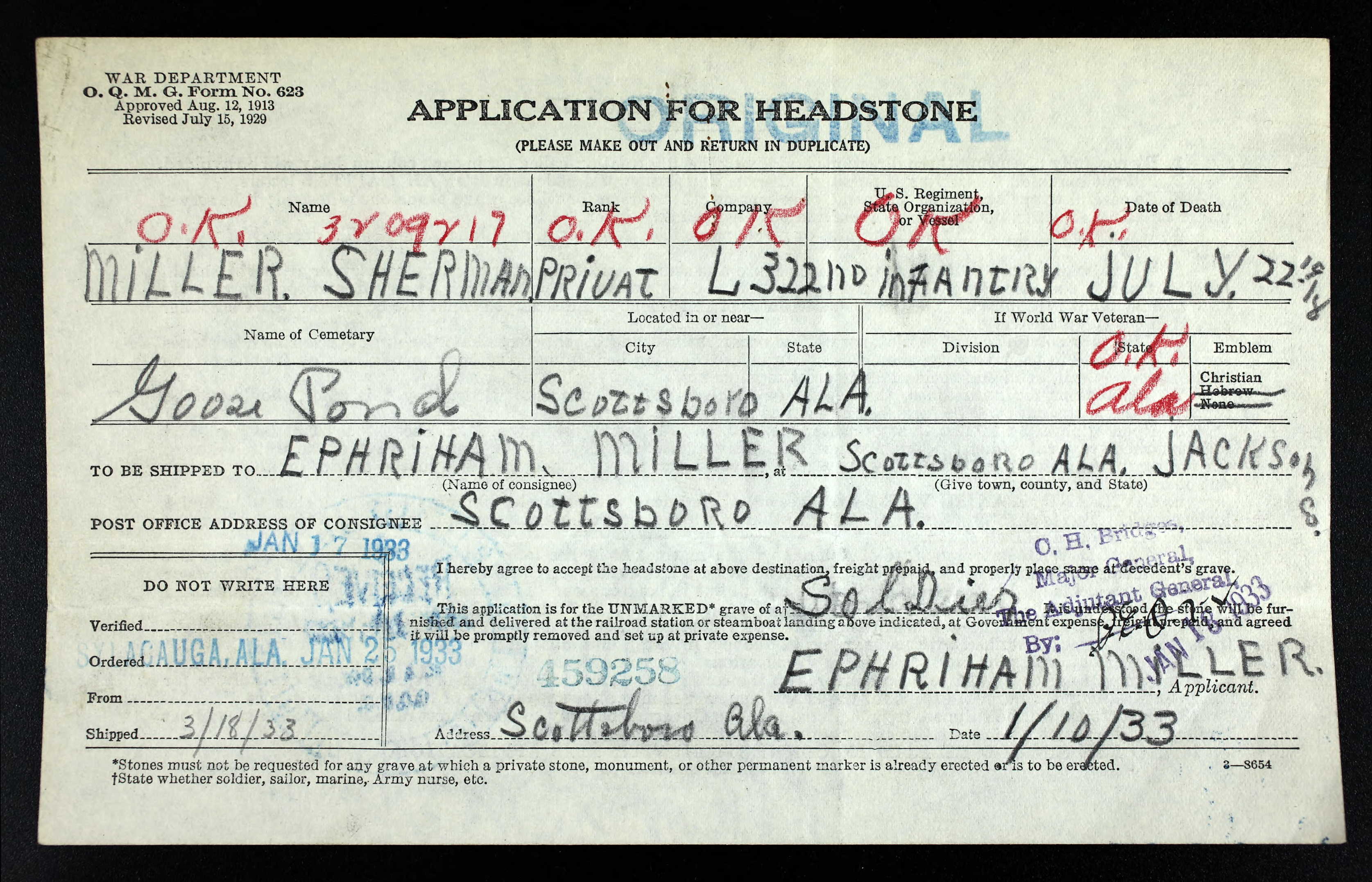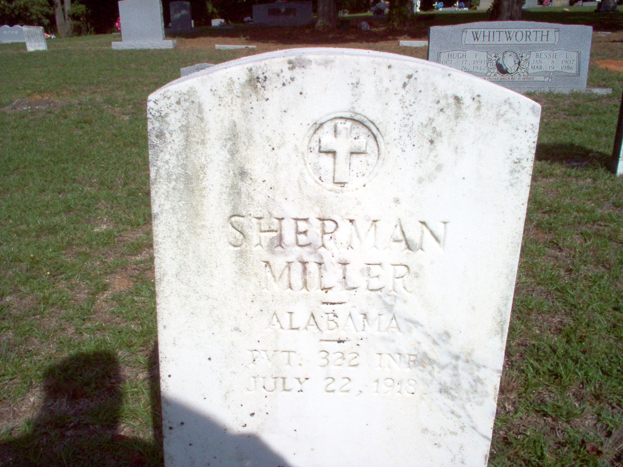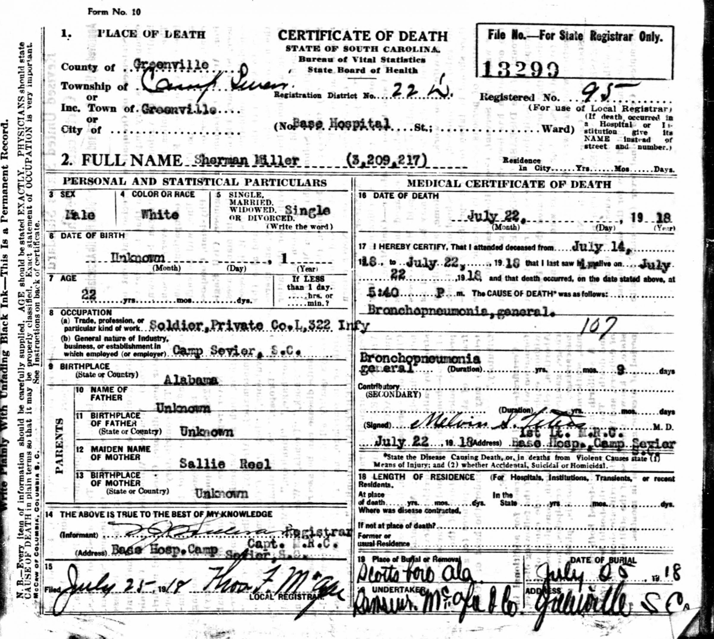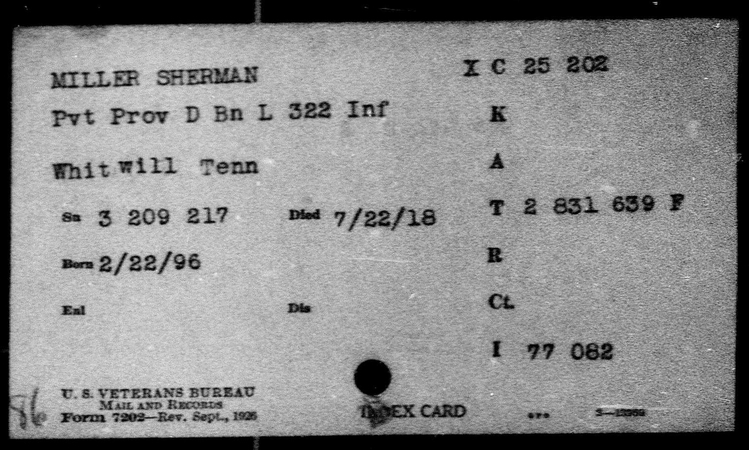 Born 22 February 1896, Bledsoe County, Tennessee, and resided in Scottsboro, Alabama. He died at the Base Hospital at Camp Sevier, Greenville, South Carolina, 22 July 1918. Served in the 322nd Infantry Regiment, Company L. He died age 22 of general bronchopneumonia.